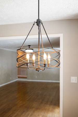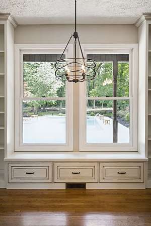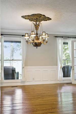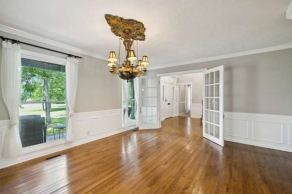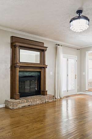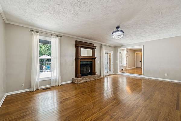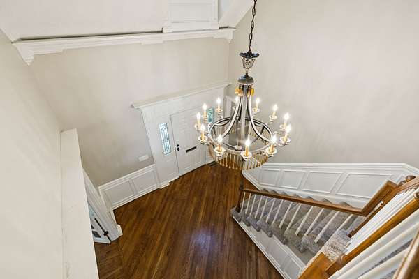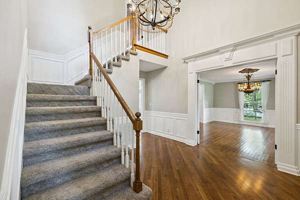 The sunken living room features a cozy wood-burning fireplace. The formal dining room features an antique chandelier and buffet niche. A grand foyer with custom crown molding and a statement chandelier.
