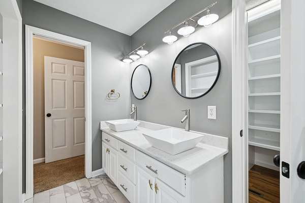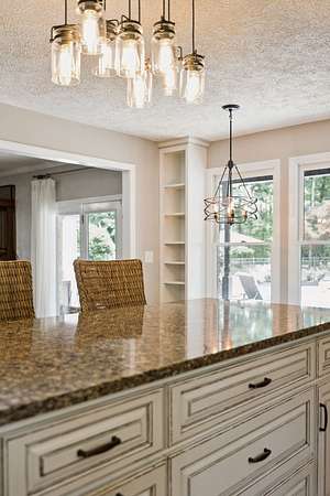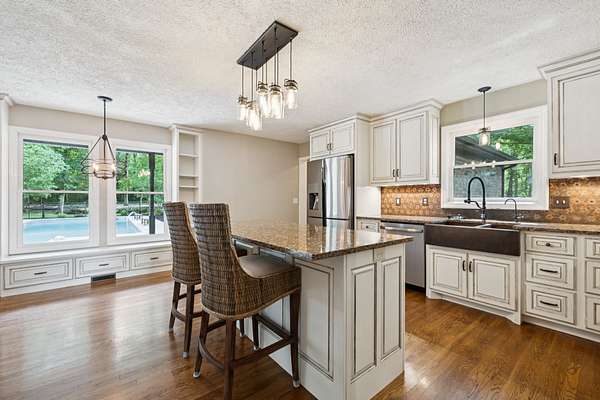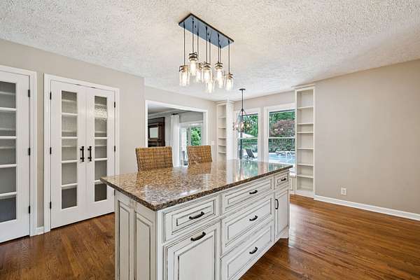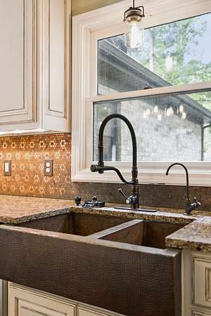 The gourmet-style kitchen is a chef's dream with granite countertops, copper farmhouse sink, gas cooktop, double ovens, oversized island, built-in microwave, custom cabinetry, bay window seating, remodeled double pantry, and reverse osmosis water filtration. All kitchen appliances stay!