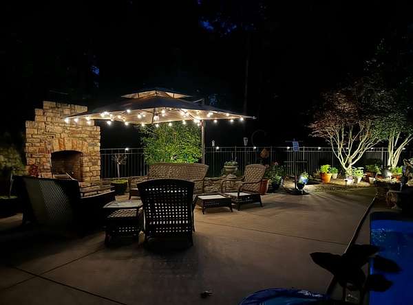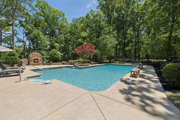 Outside is a backyard oasis! Enjoy a covered porch, stone fireplace, 46,000-gallon in-ground pool with stone spa and cascading waterfall, and a 1200 sq ft detached shop with loft and A/C office.