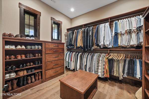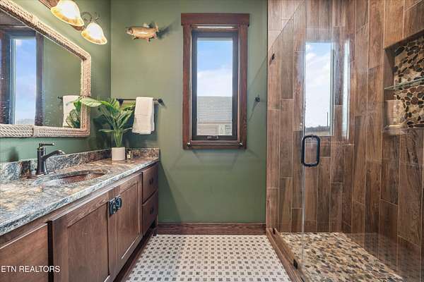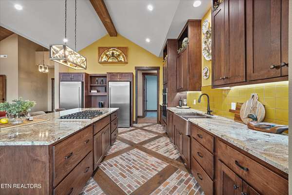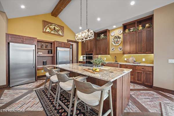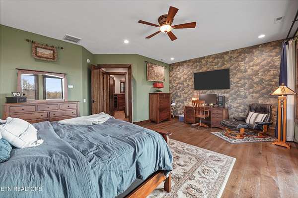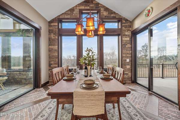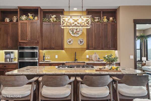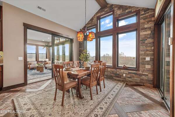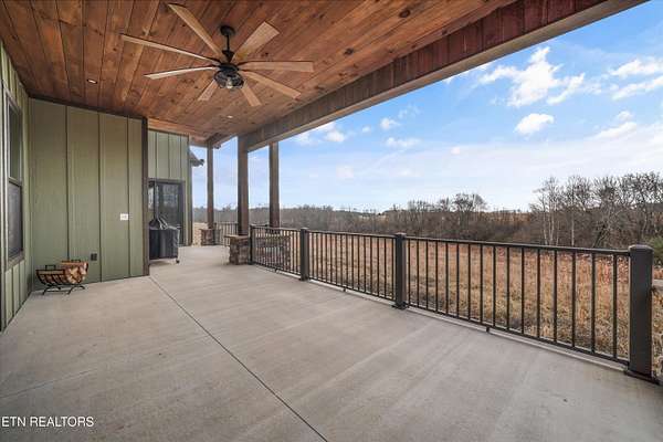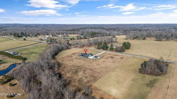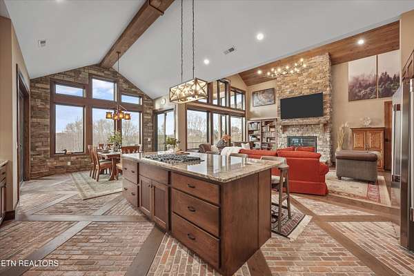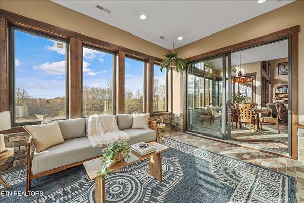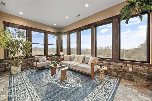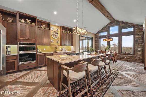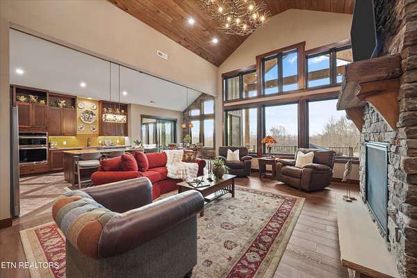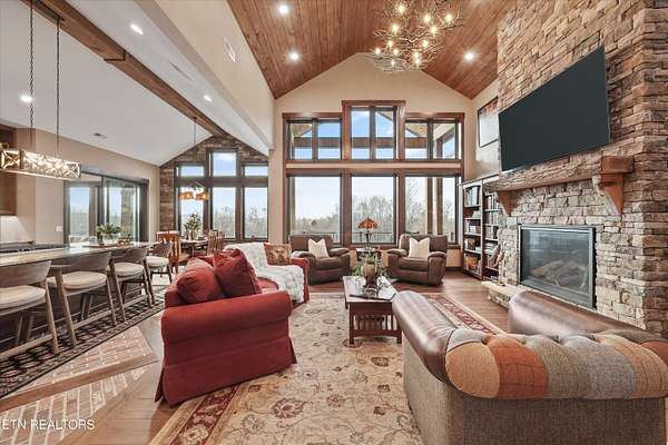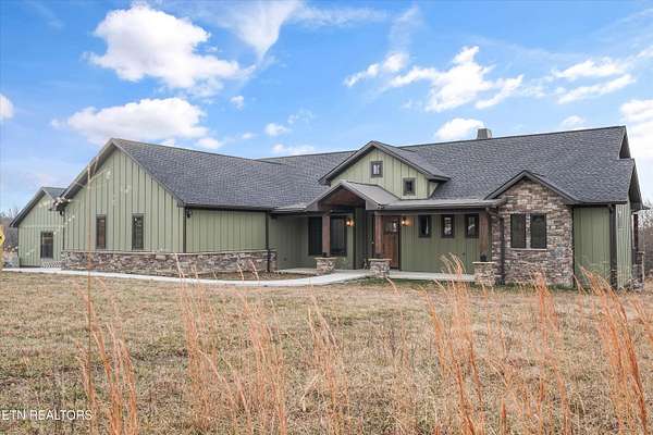Set on 5.23 acres of rolling Tennessee landscape, this custom-built estate offers a rare blend of architectural craftsmanship, natural surroundings, and refined mountain-inspired design. From the moment you arrive, the home's exterior makes a statement with a striking combination of stonework and HardiePlank siding, paired with a thoughtfully designed architectural roofline and covered entries that complement the surrounding terrain. Both the front and rear patios feature tongue-and-groove wood ceilings, extending the home's craftsmanship outdoors and creating inviting spaces designed for year-round use. Inside, hickory hardwood flooring runs throughout the living areas, anchoring the home with warmth and durability while setting the tone for the exceptional finishes found at every turn. The main living space showcases soaring ceilings accented with wood detailing, expansive windows, and a floor-to-ceiling stone fireplace that serves as a dramatic focal point. Walls of glass frame long-range views across the acreage and toward the mountains, creating a dynamic backdrop that evolves with the seasons. The open-concept design flows seamlessly into a custom kitchen where both form and function shine. In addition to custom cabinetry, premium appliances, and a generous center island, the kitchen features a distinctive patterned floor design that adds architectural interest and clearly defines the space-an intentional detail that elevates the heart of the home beyond standard finishes. Multiple living and seating areas provide flexibility for entertaining or everyday living, including sun-filled spaces designed to take full advantage of the surrounding views. The home offers three bedrooms with custom closet organizers, reflecting the level of planning and storage rarely found in homes of this caliber. An expansive laundry room is paired with a large pantry discreetly tucked out of sight, enhancing functionality while maintaining a clean, uncluttered aesthetic. The primary suite is a true retreat, offering generous proportions, direct access to outdoor living, and a spa-inspired bath complete with custom tile work, dual vanities, a walk-in shower, and bidet-equipped bathrooms-a detail that underscores the home's attention to comfort and modern convenience. Outdoor living is equally impressive, with covered and open spaces overlooking the acreage and offering frequent wildlife sightings. The property also features two garages-an attached two-car garage for everyday convenience and a detached two-car garage ideal for additional vehicles, storage, or workshop use. From an infrastructure standpoint, the home is exceptionally well-equipped with electric, natural gas, public water, fiber optic internet, and a Generac whole-home generator, providing reliability and peace of mind without sacrificing the rural estate setting. Thoughtfully designed, meticulously built, and ideally positioned just minutes from town amenities, this property delivers custom luxury on acreage with mountain views-a combination that is increasingly hard to find in today's market.