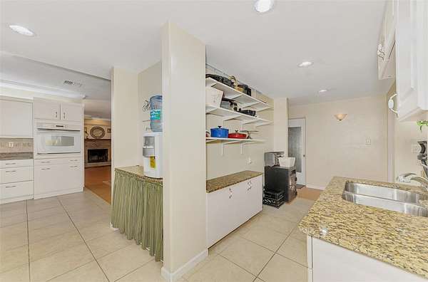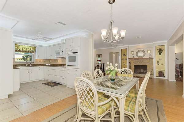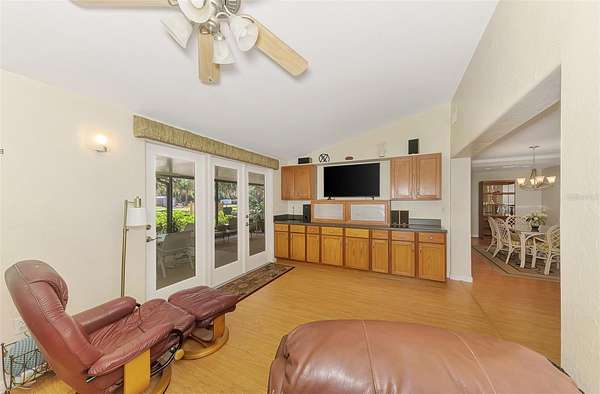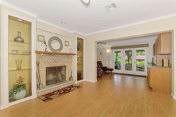 Inside, the heart of the home is a chef-inspired kitchen with three ovens, two sinks, and generous prep space—ideal for entertaining or large family gatherings. Natural light pours in through floor-to-ceiling front windows, creating a warm and inviting atmosphere. The cozy living room with brick fireplace and built-ins adds charm, while French doors lead from the separate TV room to an expansive screened lanai—perfect for morning coffee and peaceful garden views.