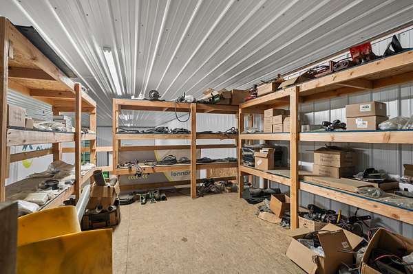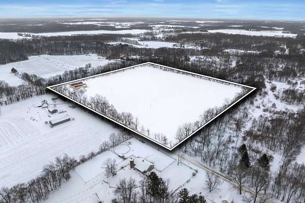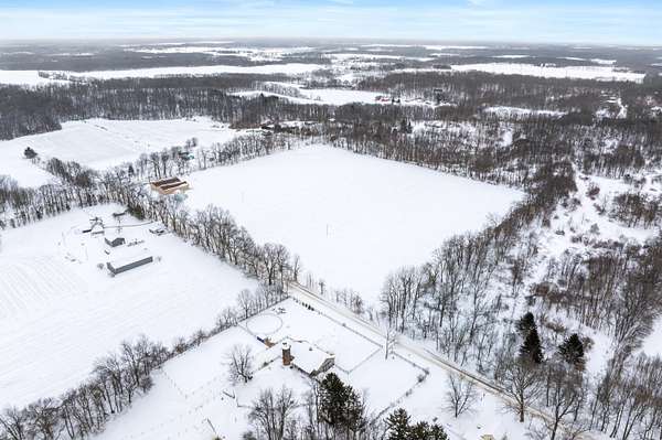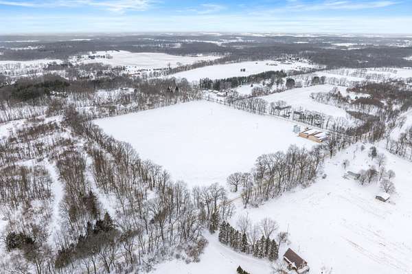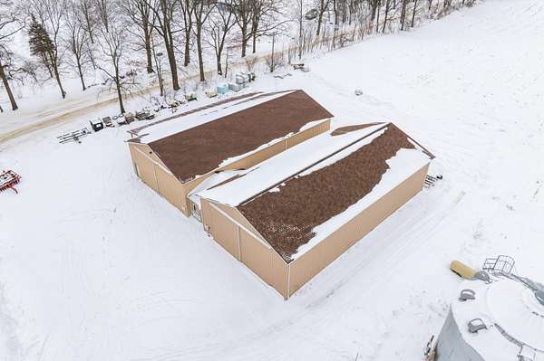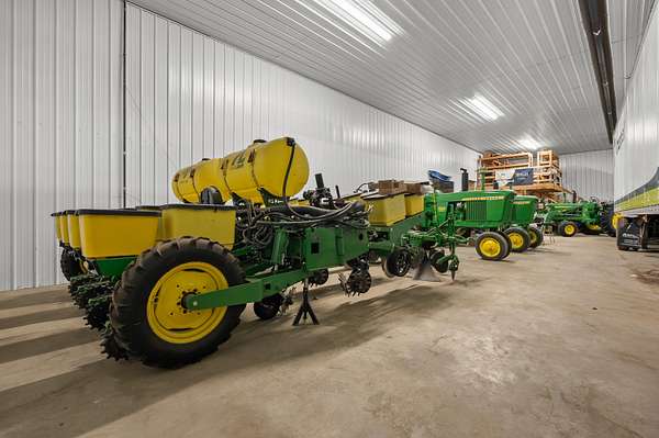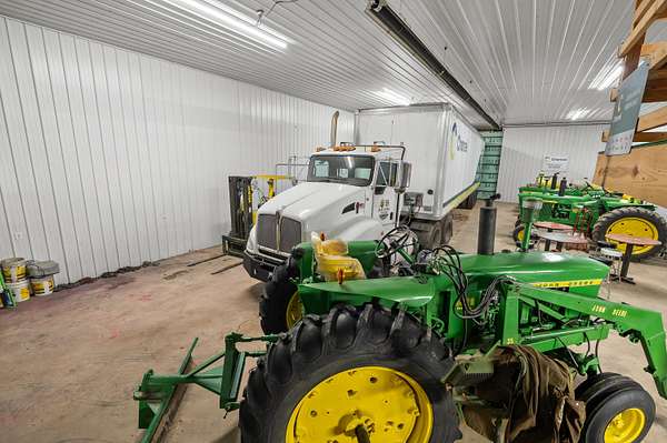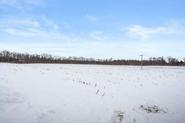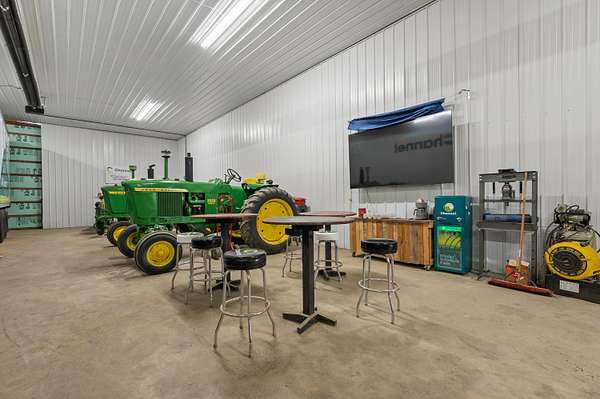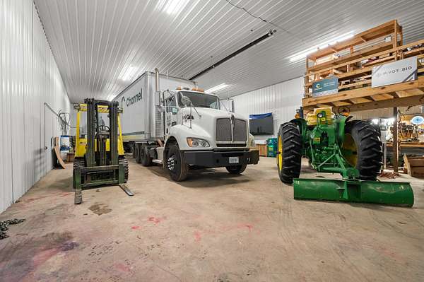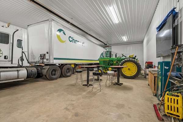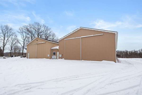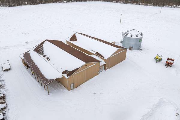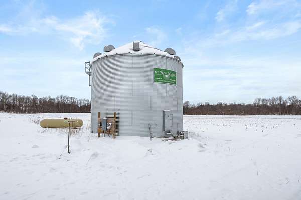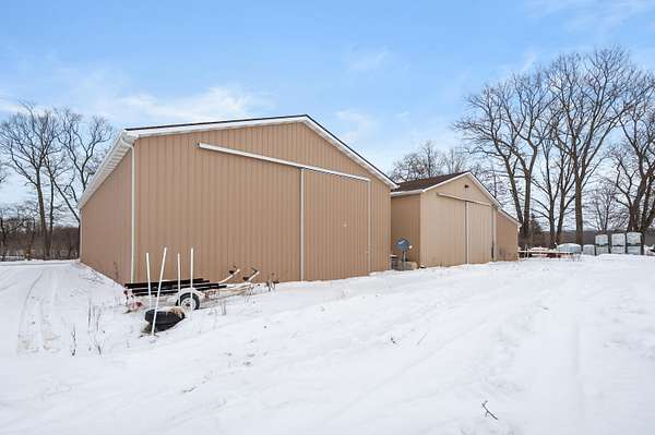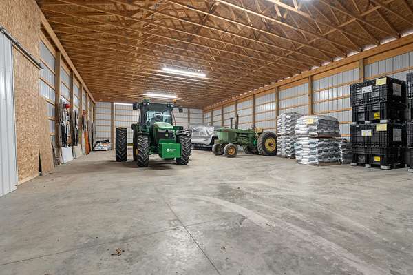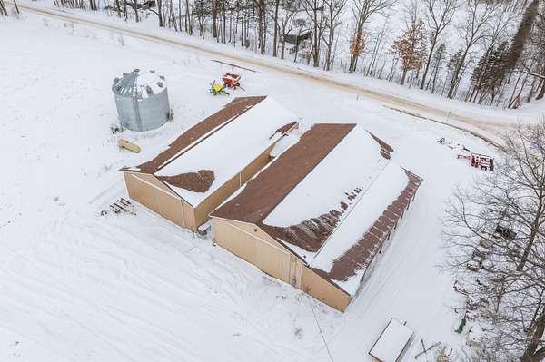 Expansive property offers exceptional features ideal for agricultural, storage, or workshop use. Situated on 20 acres surrounded by mature trees, the site provides privacy and ample space for a variety of activities. The centerpiece of the property consists of two large pole barns, each measuring 40 feet by 80 feet and totaling 6,400 square feet. Barns are connected by a breezeway and office area, enhancing functionality and workflow. Both barns have cement floors, with the West barn featuring a robust 5-inch fiberglass-reinforced concrete slab for enhanced durability. Access is convenient, w/ two 14-foot wide doors on both the north and south sides of each barn. East pole barn is insulated & heated, equipped w/ a workbench and a second-story loft for parts storage, making it the perfect space for year-round projects or equipment maintenance. Multiple 220-volt electrical connections are available throughout for high-demand tools & machinery. Motivated Seller, Will look at offers! A bathroom is present with a 5-inch well and septic system. Additional features include a 1,152 sq ft lean-to attached to the east barn and a crushed concrete pad surrounding both barns, providing convenient outdoor workspace and vehicle/equipment staging. For grain storage, the property boasts a 15,000-bushel grain bin equipped with stirrators and a modern drying system, only three years old, ensuring efficient crop handling and preservation. There is also a separate steel grain bin (built in 2023) with a vented floor, 706 sq ft of floor area, a 94-foot perimeter, and 18-foot height. Overall, this property provides an outstanding combination of spacious structures, utility connections, modern amenities, and well-designed agricultural infrastructure on a scenic, private lot.