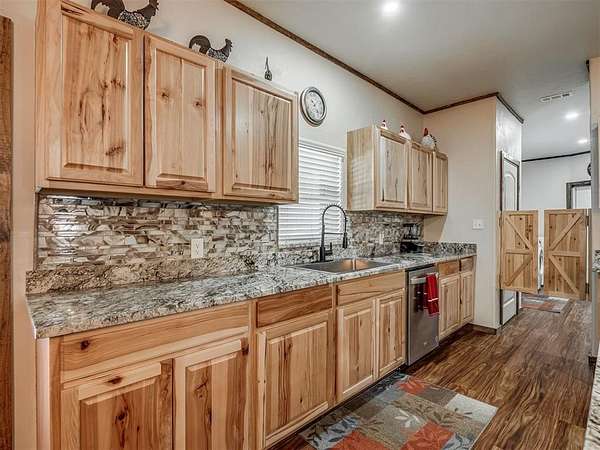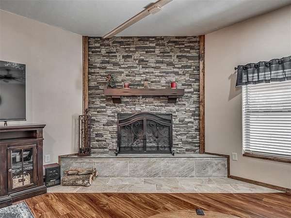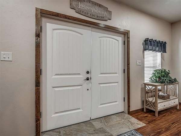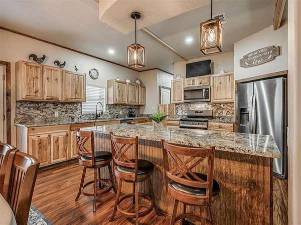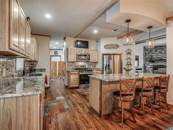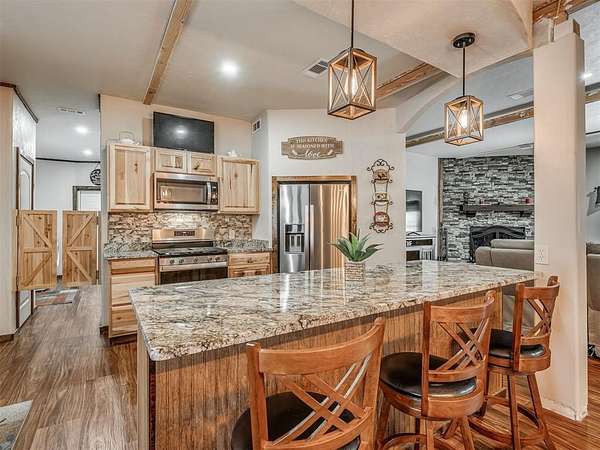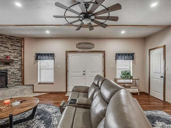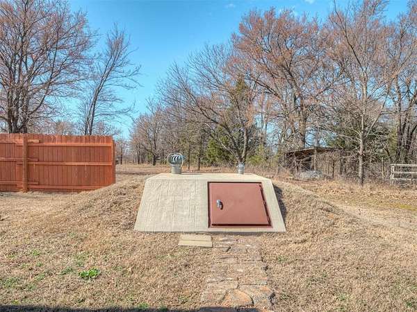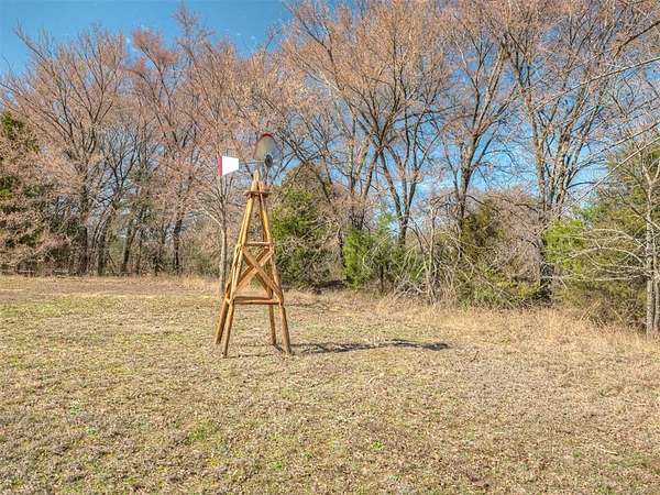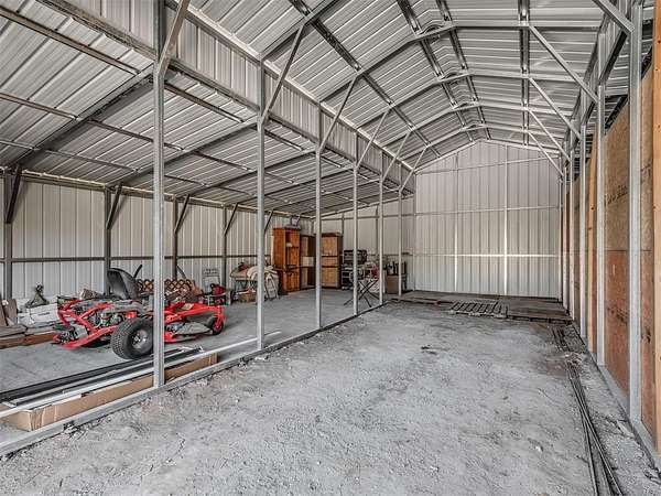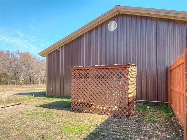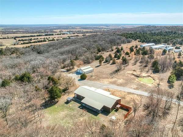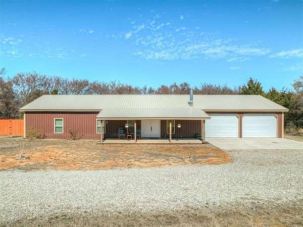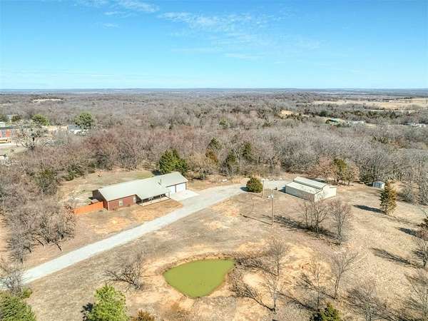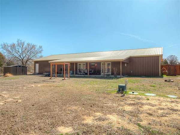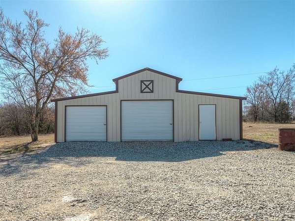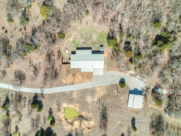 Located in a rural area of Okfuskee County and within the Bearden Public School district, this 18-acre property offers a blend of open and wooded terrain with functional improvements in place. The acreage is partially cleared around the home and barn, with the remaining land in timber. Graded topography provides usable ground suitable for livestock, recreation, or additional improvements. The 2924 SF home features an open-concept layout with 3 bedrooms and 2 bathrooms. Interior amenities include a wood-burning fireplace, large walk-in pantry, generous closets, and upgraded finishes throughout. The primary suite includes a spa-style bath with enhanced fixtures and finishes. Outdoor living space is supported by a 10' x 30' covered front porch and a 12' x 40' covered rear porch. The rear porch is plumbed and prepped for the addition of a spa. Additional improvements include a barn, multiple storage buildings, two ponds, and a gated entrance. Property features an in-ground storm shelter, cistern for water collection, and is wired and prepared for generator installation. Suitable for buyers seeking a rural residence with acreage, agricultural potential, and modern construction. Buyer to verify all information.