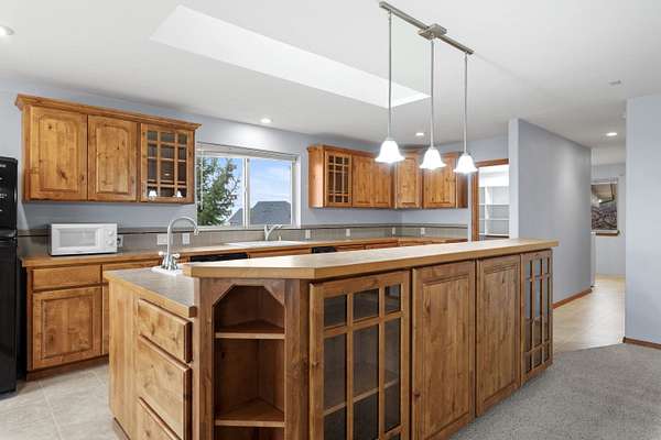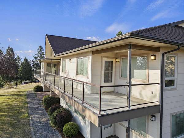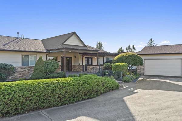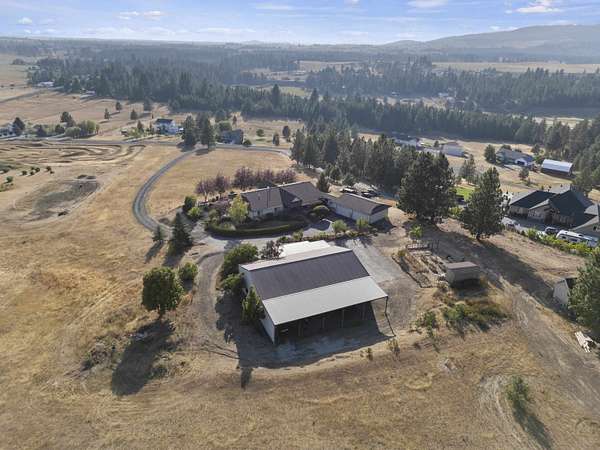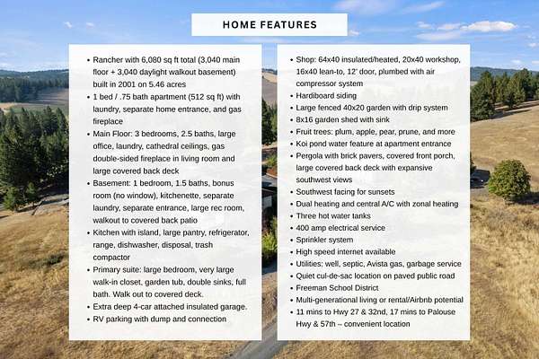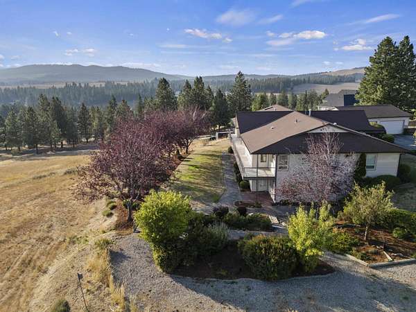 Spacious rancher on 5.46 acres with 6,080 sq ft in the main home plus a 512 sq ft 1 bed/.75 bath apartment with its own laundry. Main floor offers 3 beds, 2.5 baths, office, and laundry; daylight walkout basement includes 1 bed, 1.5 baths, bonus room, kitchenette, and separate laundry. Large kitchen with island, pantry, and all appliances. Primary suite features walk-in closet, garden tub, and double sinks. 4-car extra deep attached garage plus RV parking with dump/connection. Heated/insulated 64x40 shop with 20x40 workshop, 16x40 lean-to, 12' door, and air compressor. Grounds include fenced 40x20 garden with drip system, 8x16 shed with sink, fruit trees, koi pond, pergola, and water feature. Covered front porch and back deck capture stunning southwest views. Zonal heating, central A/C, 2 hot water tanks, sprinkler system, central vac, and 400 amp service. Well, septic, Avista gas, and garbage service. Freeman School District. Built in 2001.