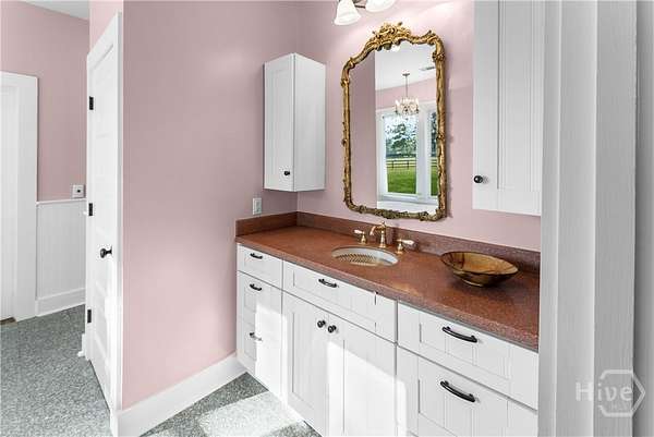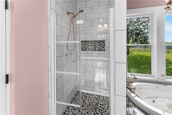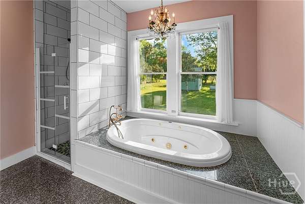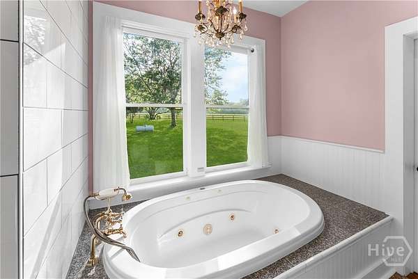 - Breakfast Area, Breakfast Bar, Ceiling Fan(s), Country Kitchen, Double Vanity, Fireplace, Garden Tub/Roman Tub, High Ceilings, Kitchen Island, Main Level Primary, Pull Down Attic Stairs, Separate Shower