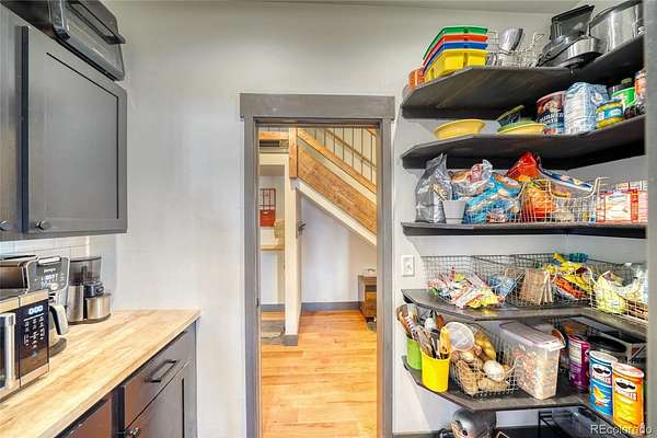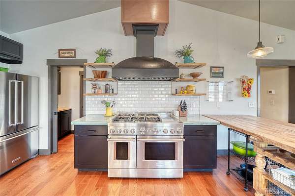 The chef's kitchen is appointed with high-end KitchenAid stainless steel appliances, including a six-burner range with double ovens and griddle. Custom dyed and sealed concrete countertops, a handcrafted wood island with eat-in seating, generous prep space, and a butler's pantry create both beauty and function for gathering and daily living.
