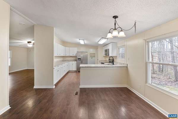 VERY AFFORDABLE, move-in ready 3-bedroom, 2-bath home offers 1,836 square feet of comfortable living space on a large 5.66 acre lot. Freshly updated with newer Kitchen and floor coverings throughout, Large screened porch and two new decks on back, this home is perfect for first-time buyers or anyone looking to downsize without sacrificing space or privacy. You'll love the peaceful setting and the convenience of a wonderful location, ideal for commuting to Charlottesville and only 5 miles to Scottsville... while still enjoying a quiet, rural atmosphere. The large lot offers plenty of room for gardening, a small creek near back yard. Don't miss this opportunity – all at an affordable price!