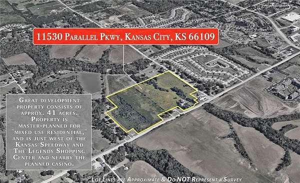 Est $70,921/moThis great development property consists of approx. 41 acres. Property is master-planned for "mixed use residential," and is just west of the Kansas Speedway and The Legends Shopping Center and nearby the planned casino. Perfect location for apartments or a church, any type of institutional user as well as multi-family or residential. Great location -Property is development ready and close to highway and in the path of development. There is a home on the property that is currently rented - please do not disturb. Great garage space and two barns.