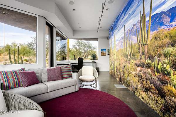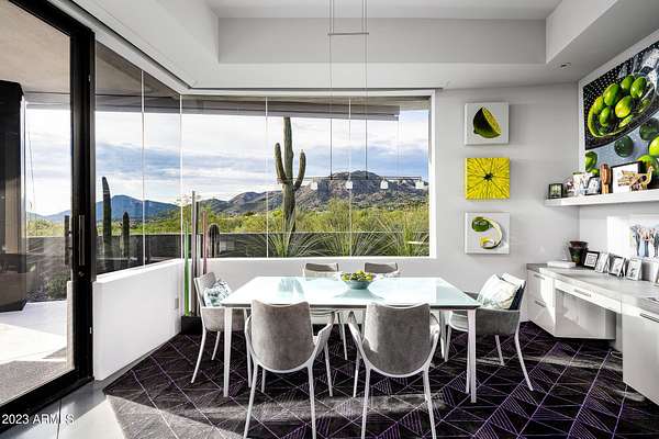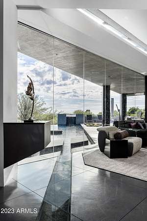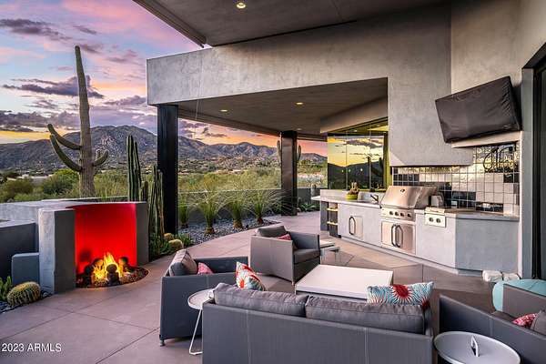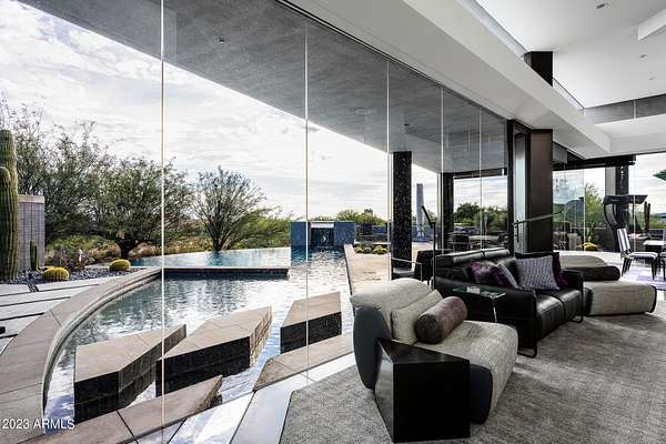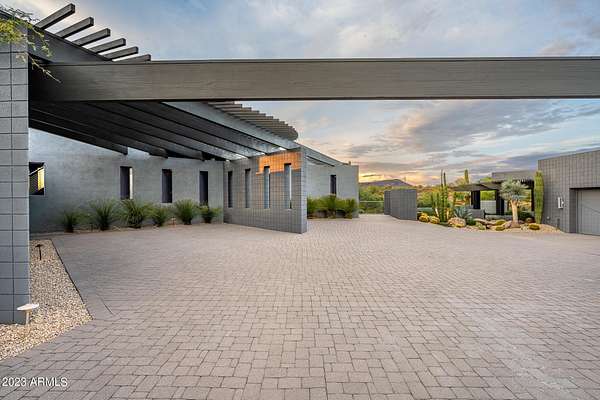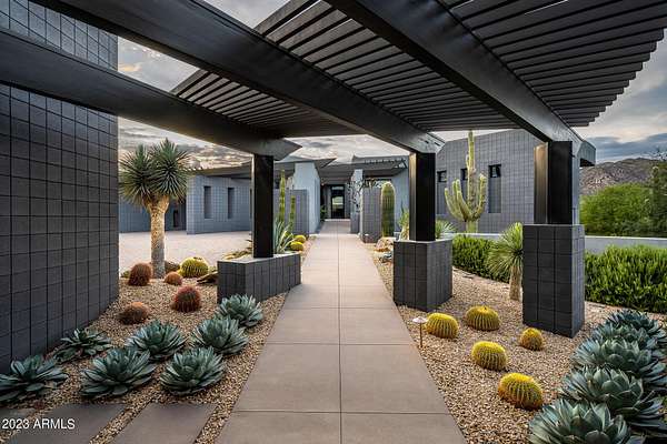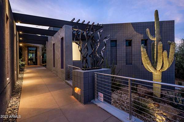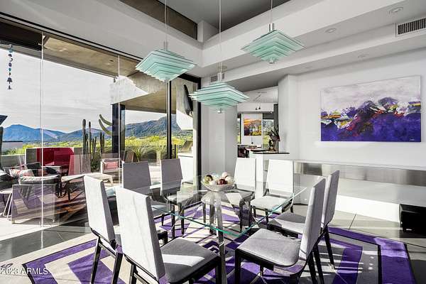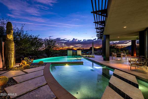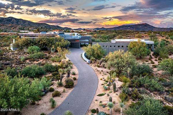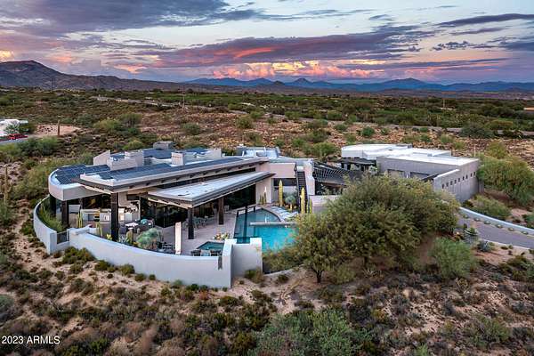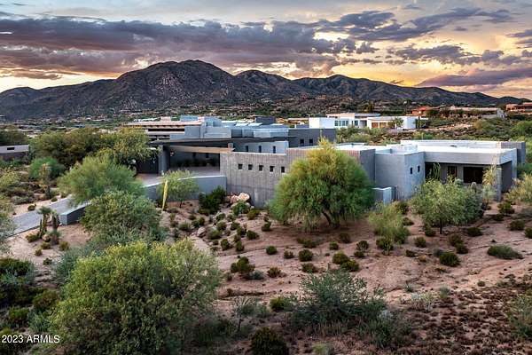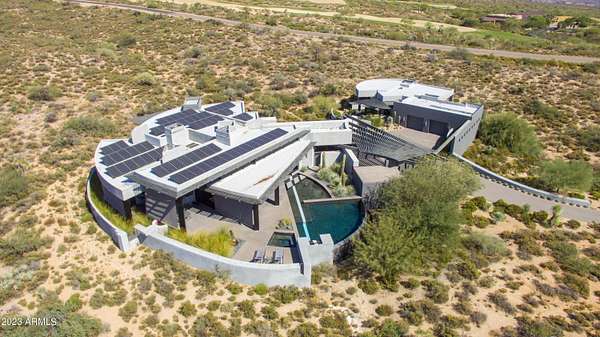Golf membership is available with the purchase of this dramatic one-of-a-kind contemporary home. Architects Lee and Jessica Hutchison's multiple award winning custom built home sits centered on three acres of lushly vegetated and landscaped Sonoran desert with numerous trees and saguaros. The home is situated on a ridge for full sunrise and sunset views, views of the Four Peaks to the east, dramatic mountain views to the north and west, and full city lights and valley views from the upper observation deck. This sophisticated masterpiece is comprised of a 3,947 sq. ft main house with two primary suites and a 1,235 sq ft totally independent two bedroom guest house with a large living room, laundry, and kitchenette. Expansive walls of glass capture the mountain and desert views from every room. The outdoor living and kitchen areas of over 2,200 sq. ft have sweeping overhangs designed for seamless indoor/outdoor living. Additional features include architecturally detailed vaulted ceilings with skylights, Lutron lighting, polished concrete floors, European cabinetry, lighting and plumbing fixtures. An air conditioned three car garage has an extra room for golf gear or storage, with a large carport accommodating several more vehicles. The entire house is powered by highly efficient solar panels. A unique water feature runs from the entry courtyard, through the foyer, and connects to the pool. It celebrates the connection to nature and is in direct alignment with the rising sun at the seasonal solstice. Truly a unique and special home. Offered as furnished/turn key with some minor personal exclusions. Awards: 2007 Gold Nugget - Award of Merit 2007 Best in American Living - Gold Revegetation of numerous trees, saguaros, plants, with permanent irrigation which can be turned on or off- roughly $400K expense. 2019 -trellis sandblasted and painted, house painted -2019 -driveway landscaping added -2020 -pool entirely resurfaced with new tile and converted from salt to chlorination -2021 -New HVAC in master bedroom - 2019 -New HVAC for addition on main house and in garage -2020 -New HVAC in main house AND guest house- 2021 5 units total - partial roof area resurfaced - 2023 - External house painted and water sealed- 2023