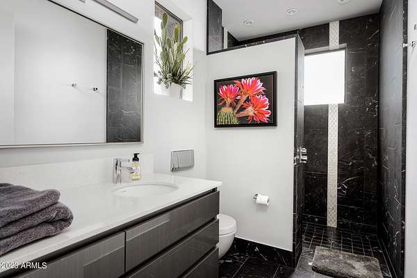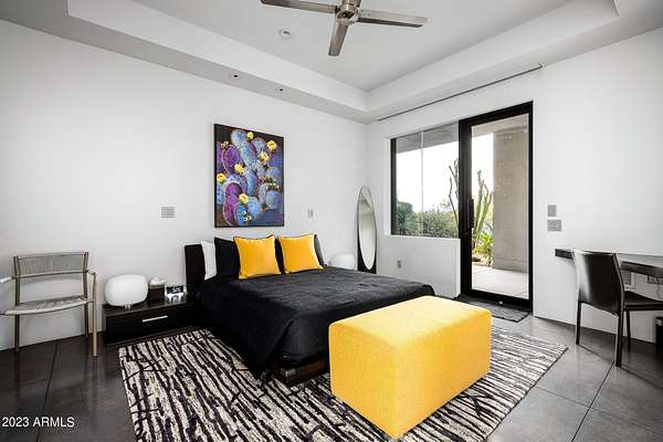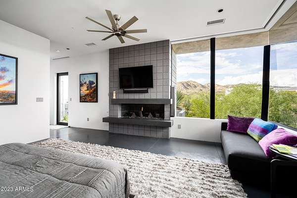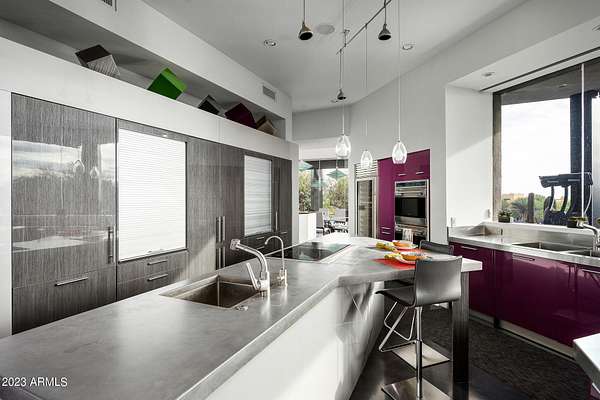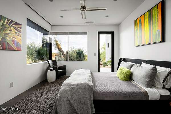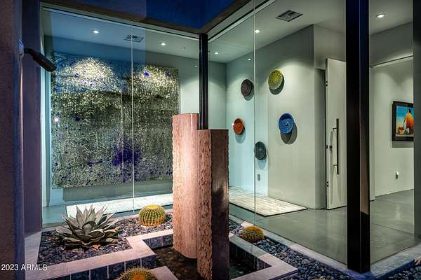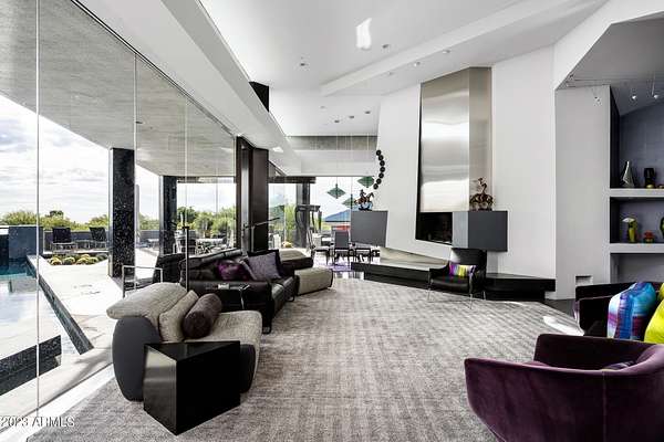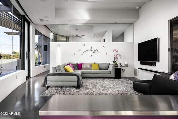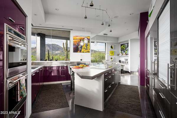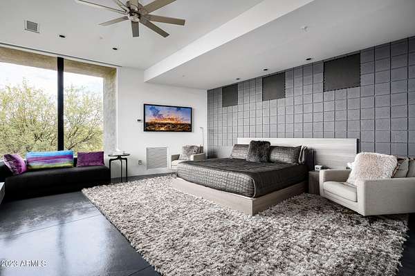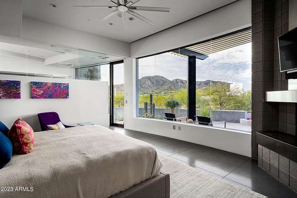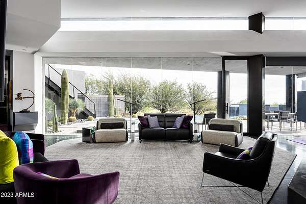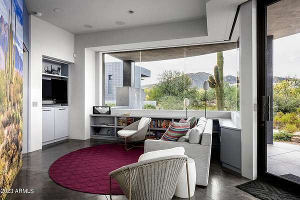 Golf membership is available with the purchase of this dramatic one-of-a-kind contemporary home. Architects Lee and Jessica Hutchison's multiple award winning custom built home sits centered on three acres of lushly vegetated and landscaped Sonoran desert with numerous trees and saguaros. The home is situated on a ridge for full sunrise and sunset views, views of the Four Peaks to the east, dramatic mountain views to the north and west, and full city lights and valley views from the upper observation deck. This sophisticated masterpiece is comprised of a 3,947 sq. ft main house with two primary suites and a 1,235 sq ft totally independent two bedroom guest house with a large living room, laundry, and kitchenette. Expansive walls of glass capture the mountain and desert views from every room. The outdoor living and kitchen areas of over 2,200 sq. ft have sweeping overhangs designed for seamless indoor/outdoor living. Additional features include architecturally detailed vaulted ceilings with skylights, Lutron lighting, polished concrete floors, European cabinetry, lighting and plumbing fixtures. An air conditioned three car garage has an extra room for golf gear or storage, with a large carport accommodating several more vehicles. The entire house is powered by highly efficient solar panels. A unique water feature runs from the entry courtyard, through the foyer, and connects to the pool. It celebrates the connection to nature and is in direct alignment with the rising sun at the seasonal solstice. Truly a unique and special home. Offered as furnished/turn key with some minor personal exclusions. Awards: 2007 Gold Nugget - Award of Merit 2007 Best in American Living - Gold Revegetation of numerous trees, saguaros, plants, with permanent irrigation which can be turned on or off- roughly $400K expense. 2019 -trellis sandblasted and painted, house painted -2019 -driveway landscaping added -2020 -pool entirely resurfaced with new tile and converted from salt to chlorination -2021 -New HVAC in master bedroom - 2019 -New HVAC for addition on main house and in garage -2020 -New HVAC in main house AND guest house- 2021 5 units total - partial roof area resurfaced - 2023 - External house painted and water sealed- 2023