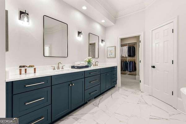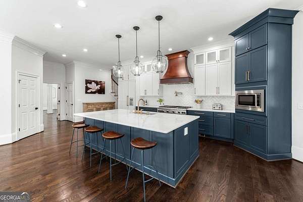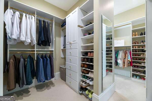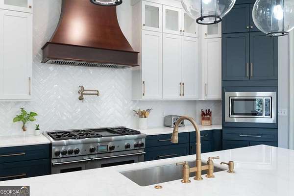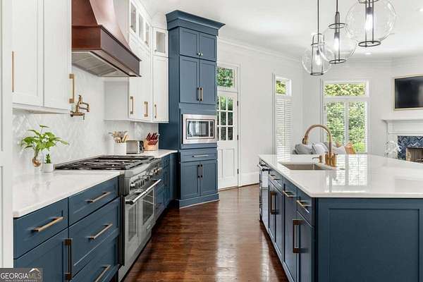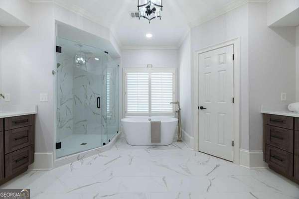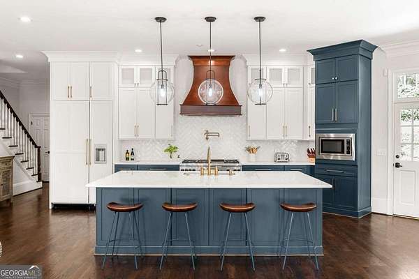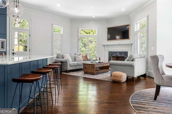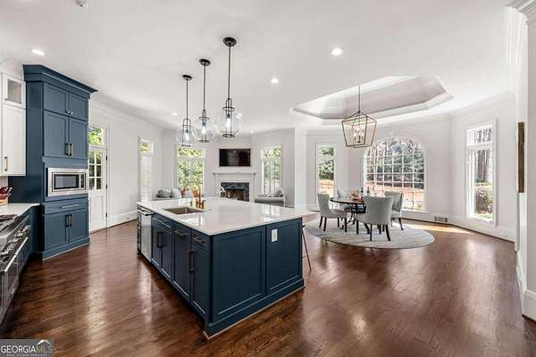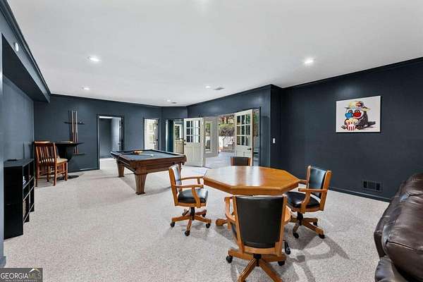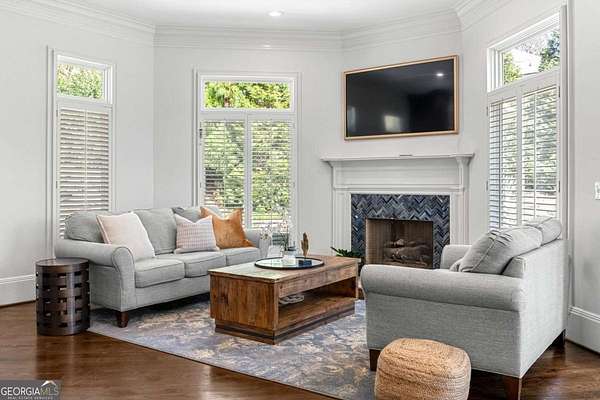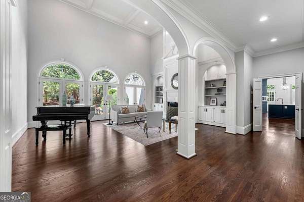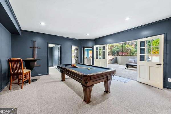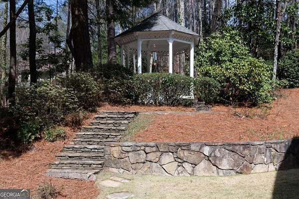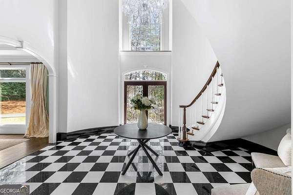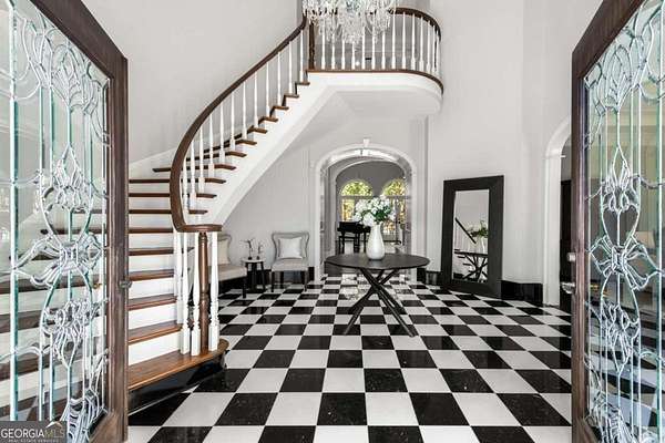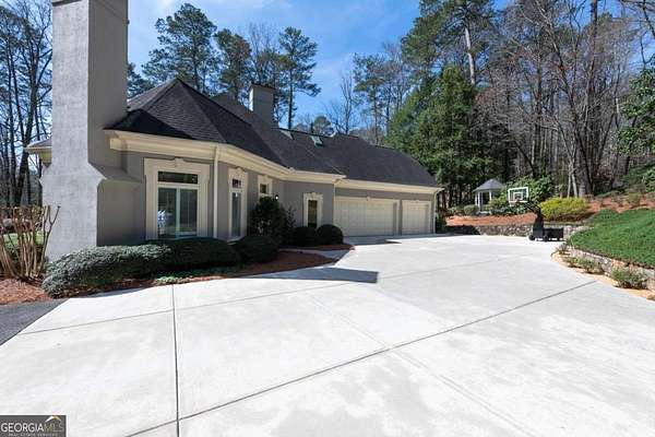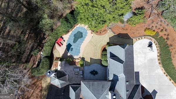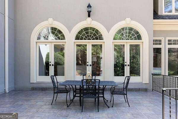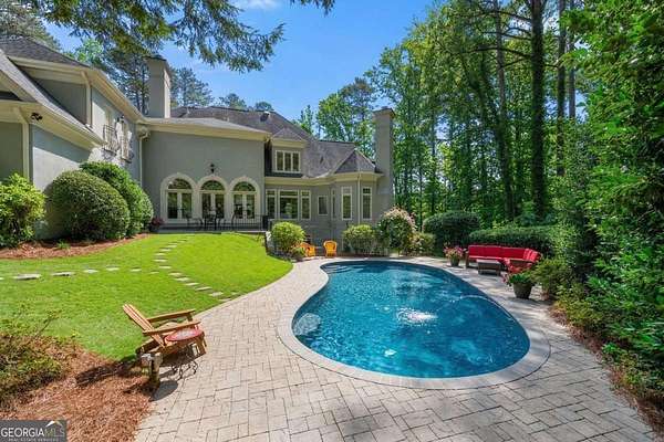Tucked behind a private gated entrance, just off Northside Drive, and surrounded by 2.3 acres of perfectly manicured, lush landscaping, this extraordinary estate offers a peaceful retreat with timeless European elegance. A long drive welcomes you past a tranquil koi pond and expansive front lawn, setting the tone for a property that blends privacy, luxury, and exceptional craftsmanship. The outdoor living spaces are equally impressive, featuring a heated gunite saltwater pool, charming gazebo, elegant paver walkways, and a spacious patio overlooking the pool and wooded surroundings-creating the perfect setting for relaxation or entertaining. The traditional European home opens to a dramatic two-story foyer with a sweeping curved staircase and stunning architectural details. The two-story living room showcases an impressive 18+ foot coffered ceiling, exquisite carpentry throughout, recessed lighting, and a fireplace. French doors lead directly to the poolside patio, seamlessly connecting indoor and outdoor living. A spacious formal dining room with butler's pantry provides an elegant setting for hosting gatherings. The completely remodeled chef's kitchen is a showpiece, featuring marble countertops, ceiling-height custom cabinetry, Thermador stainless steel appliances, a gas cooktop with vented hood, pot filler, massive breakfast bar, and a large breakfast area. The kitchen flows effortlessly into the inviting keeping room with fireplace. Hardwood flooring runs throughout the main level, complemented by plantation shutters that add warmth and sophistication. The main level also includes a luxurious primary suite overlooking the pool with a separate sitting area and fireplace that could easily serve as a private office. The remodeled spa-like bath features marble countertops and expansive his-and-hers closet systems with custom built-ins. Additional main level highlights include a judge's-paneled office with built-ins, a wet bar, two half baths, spacious mudroom with laundry, walk-in pantry, and access to the three-car garage. Upstairs, three generously sized bedrooms each feature private ensuite baths and large walk-in closets, with two offering the scale and privacy of a secondary primary suite. The terrace level is filled with natural light and designed for entertaining, offering a cedar wine room with chiller, fitness room, media area with custom built-ins, recreation space for a pool table, large bedrooms, and direct access to a private patio and convenient poolside room perfect for storing food and beverages while at the pool. Additional features include back stairs to the kitchen, an upper hallway overlooking the living room, abundant storage throughout, full attic access, and a whole-home generator-ensuring comfort, convenience, and peace of mind in this truly remarkable estate.