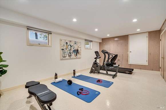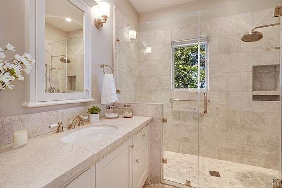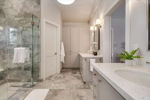 This masterfully renovated farmhouse expresses contemporary style and offers warmth and modern elegance with timeless finishes. Sited on 3+ acres with stunning vineyard & mountain views, the property presents all the hallmarks of a modern farmhouse compound with two separate dwellings. The main house features white oak floors, wood beam ceilings, & abundant windows to create a light & airy atmosphere. Living room with Napa stone fireplace, formal dining room, sumptuous primary suite, and a sophisticated country kitchen with Caesarstone counters, Viking range, farm sink, Sub-zero refrigerator, Bosch dishwasher & large bay window surround eat-in kitchen. The kitchen is located at the heart of the home and flows into the family room. The lower level has a grand recreation area, gym, private guest quarters, and a sauna. A luxurious second dwelling features a beautiful lavender garden entry, a spacious living room, a full kitchen with a Wolf range, a Sub-zero refrigerator, a farm sink, a Bosch dishwasher, beautiful cabinets, a spacious mud room, and a one-car-attached garage. Outdoor dining & entertaining around a deck & backyard patio with a beautiful fountain imported from France. A beautiful environment to accommodate family and friends for entertaining and holiday gatherings.