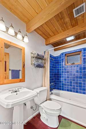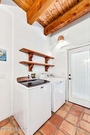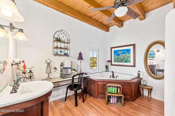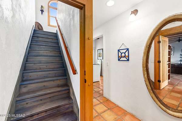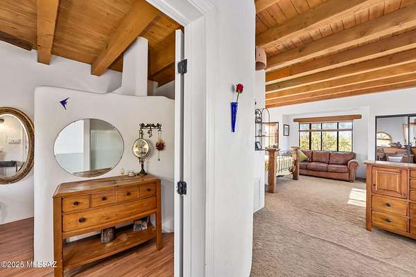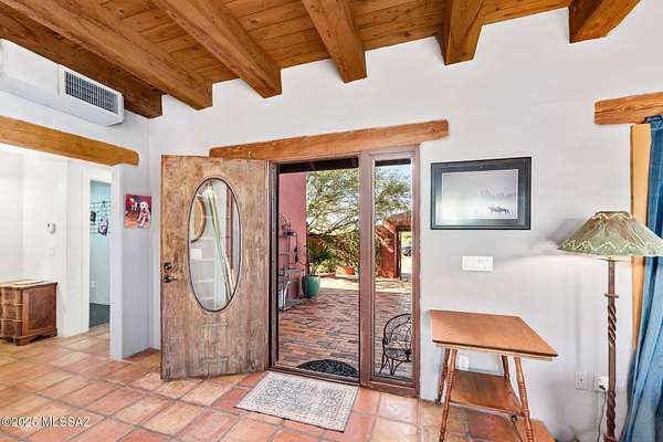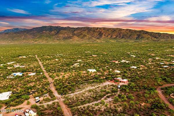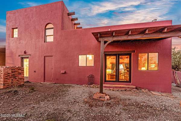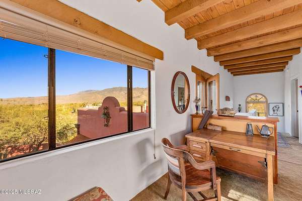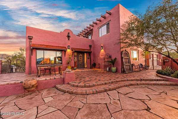 Experience the beauty and tranquility of this one-of-a-kind Southwest-style home on 5 lush acres surrounded by mountain scenery. Enjoy panoramic views of both the Rincon and Catalina Mountains, with sunsets that feel straight out of a painting. The main home features 3 bedrooms and 2 bathrooms, showcasing warm wood beam ceilings and timeless character. The primary suite spans the entire upper level, showcasing breathtaking views from it's own rooftop deck, while two bedrooms and a full bath are located downstairs. A large breezeway connects the main house to the guest studio and oversized garage/workshop. The guest house offers its own laundry, a large storage room below, and a private balcony perfect for sunrise and sunset viewing. Zoned for horses and free from HOA restrictions, this property offers endless possibilitiesadd a pool, expand the footprint, or simply enjoy the space as-is. The front courtyard is a serene retreat surrounded by mature vegetation and mountain viewsan ideal setting for peaceful mornings or entertaining under the stars. A true sanctuary; Perfect for cyclists, artists, or multi-generational living just five minutes from Saguaro National Monument East and less than ten minutes to Houghton Northwest Hospital, shopping, dining, and entertainment.