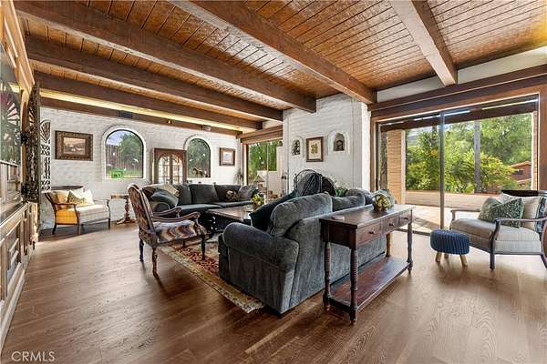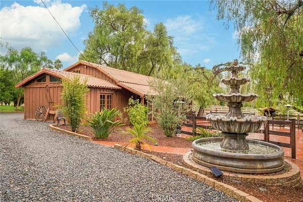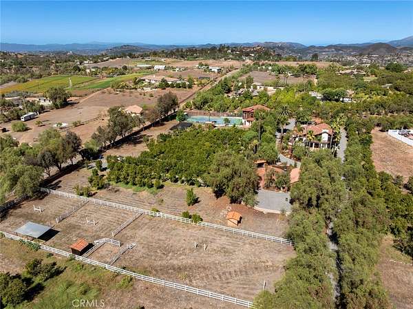 With a rare blend of old-world charm and modern amenities, this hacienda style estate brims with history, grace, attention to the details for fine living, entertainment and enjoyment of the land. The main house showcases classic hacienda elements plus a generous guest house provides a comfortable stay for visitors. Nestled on over 6 lush acres, everything was designed for unforgettable gatherings. The expansive entertainment pavilion features party rooms, a kitchen, bathroom and bar. Host lively events on the dance floor, dine under ambient lighting, or enjoy live performances on the built-in stage. Stroll through your own flourishing grove of delicious Valencia oranges and passion fruit irrigated by your private well. Tend to your horses or farm animals at the nearby corrals. Grab a game at your private sport court and a swim afterwards in the refreshing sparkling pool. Eco-conscious solar panels are owned. Find dedicated parking and hookups for your RV next to a custom deck. The private gated entrance and beautiful tree lined driveway is timeless and impressive. Whether looking for a private oasis or a family compound, hobby farm or expand your crop, tend to a horse or buy another, this stunning property has it all. Contact me for your private tour today. Kris Gelbart. 858-395-0761. GelbartRealtyGroup.com.