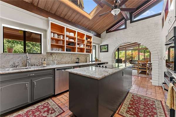 - Balcony, Bar, Beamed Ceilings, Block Walls, Built-In Features, Cathedral Ceiling(s), Ceiling Fan(s), Double Door Entry, Granite Counters, High Ceilings, Recessed Lighting, Screens, Skylight(s), Sliding Doors, Stained Glass, Stone Counters, Storage, Wood Frames Window Features, Wood Product Walls