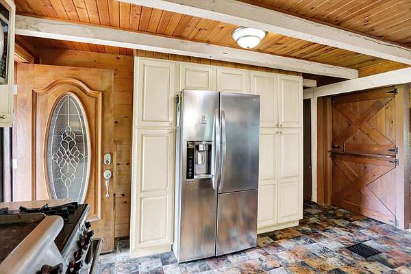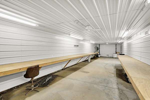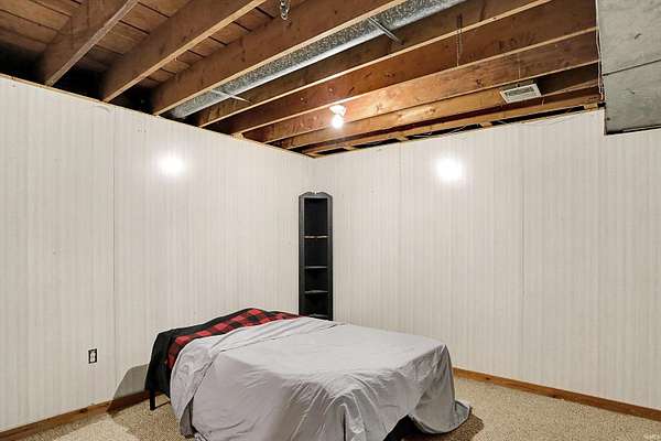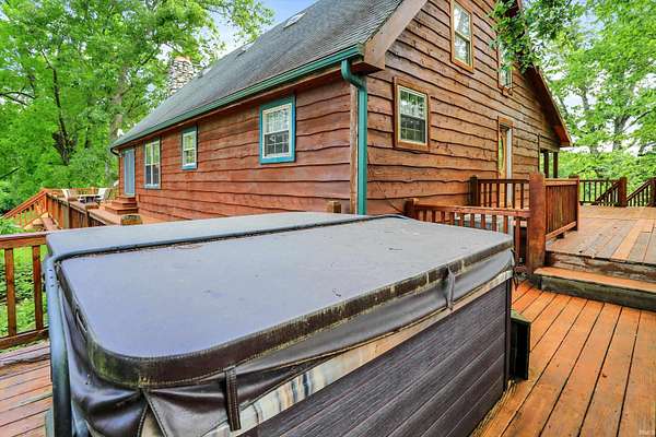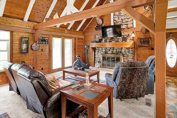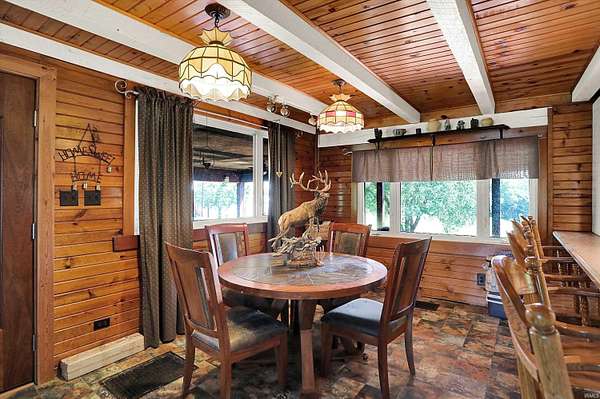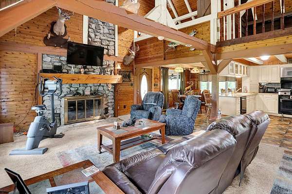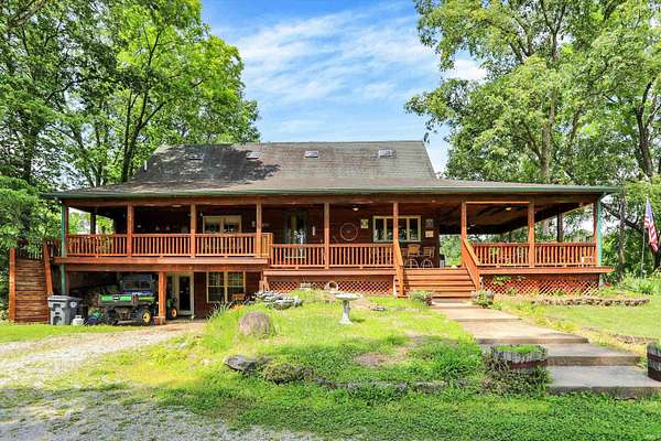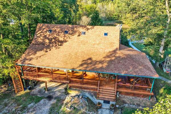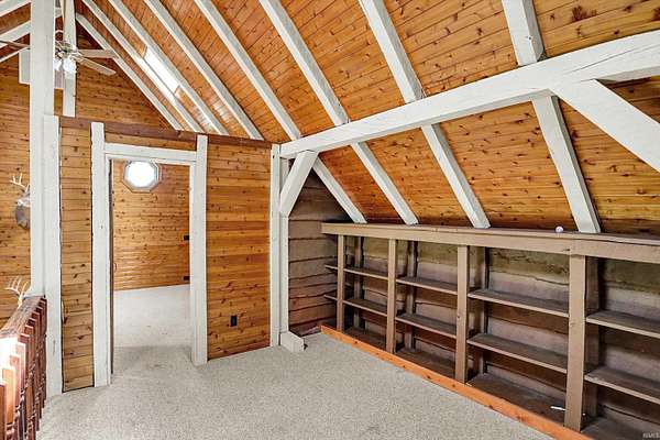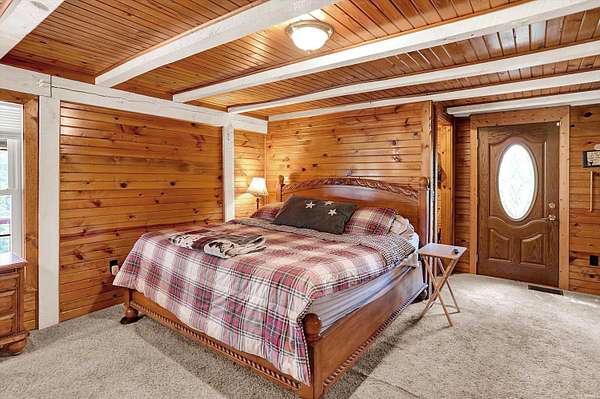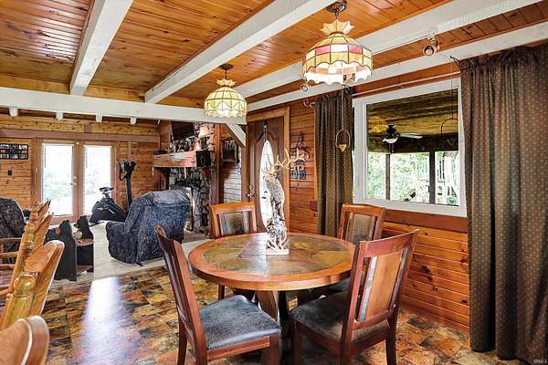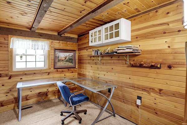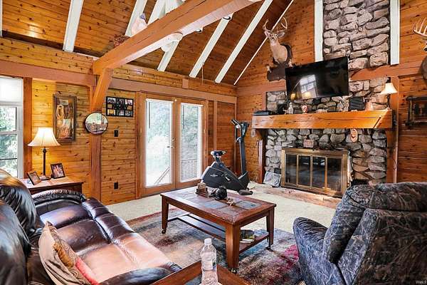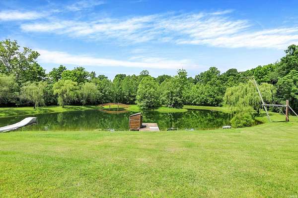 Country Dreaming in Your Own Private Oasis - Martinsville, IN Tucked away on 12.63 secluded acres, this stunning 3,100+ sq ft cedar cabin is a rare gem. Welcomed by a freshly painted wrap-around porch, and BRAND NEW ROOF this 5-bedroom, 2-bathroom home blends rustic charm with thoughtful design. Step inside to a spacious open-concept living area, featuring soaring ceilings that overlook the great room and a cozy fireplace that adds warmth and character. The main level boasts a large primary suite along with two additional bedrooms, while the upper level includes two more bedrooms and a versatile loft space-perfect for a home office or extra storage. Enjoy entertaining in the full walkout basement with its custom bar area, or escape outdoors to your private, 22-foot-deep stocked pond complete with dock, island, and charming footbridge-a truly one-of-a-kind retreat. This property offers much more, including: Three outbuildings for ample storage or hobby space Cabana/bar area ideal for summer gatherings Basketball court with Gorilla Goal Two driveways - one to the main home and another to a large finished pole barn with office space and separate entrances, ideal for rental income, business use, or a guest retreat. Whether you're looking for a peaceful homestead, a weekend getaway, or a property with income potential-this one has it all. Don't miss your chance to own this unique slice of country paradise!