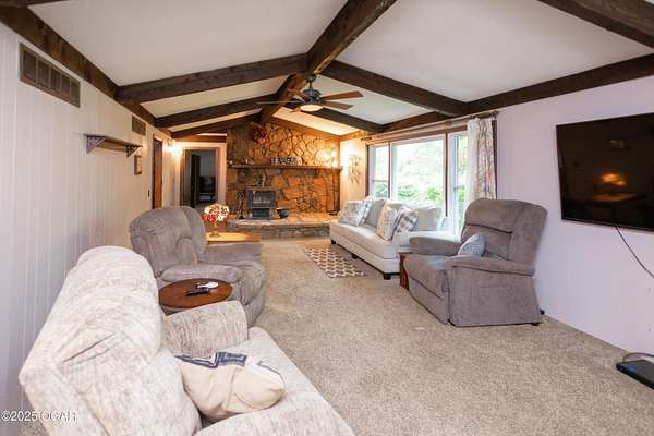 Back on the market through no fault of the seller! Live your dream life in this beautiful 3 Bedroom, 2 1/2 bath farmstead! Drive up the tree-lined lane & experience nature at it's finest with a beautiful stocked pond that is within front door view, accented by a large windmill, colorful blooming flowers, pine trees & many year around landscape features. The property is fully fenced & a separate barn is available for horses, cattle, or whatever your heart desires. This updated ranch style home has a newer metal roof & a full unfinished walk out basement that could double your living space, that's just begging to be completed. The large open kitchen with bar seating is the perfect family gathering space to create your culinary dishes, while using your homegrown produce from the garden. If you dream of relaxation, go through the double glass doors located in the dining room onto the large screened back porch & create the perfect nook to enjoy your morning coffee as you watch deer, turkey & other wild life amble through the property. Overflow for outdoor dining several months out of the year onto the screen porch. Throughout the home you will find several favorite features such as large walk in closets in each bedroom, bathrooms created for a spa feeling, pantry spaces, mud room for boots, coats & storage, thermal windows & so much more! For peace of mind during storm season, a 6 person safe room is found in the 2 car attached garage and a whole house back up power system is in place for use, if ever needed. The living room features a full Missouri rock hearth wall, wood stove & a beamed ceiling. If you are an outdoor enthusiast, this property will be your own private oasis, as @ 9 acres on the back of the property are tree filled, hilly & contains a stream to provide the perfect setting to harvest a large buck, trail ride with ATV's/horses, hiking, fishing & more! This property is listed well below appraised value, providing equity on day 1. Call now to see!