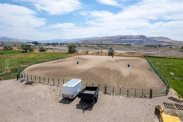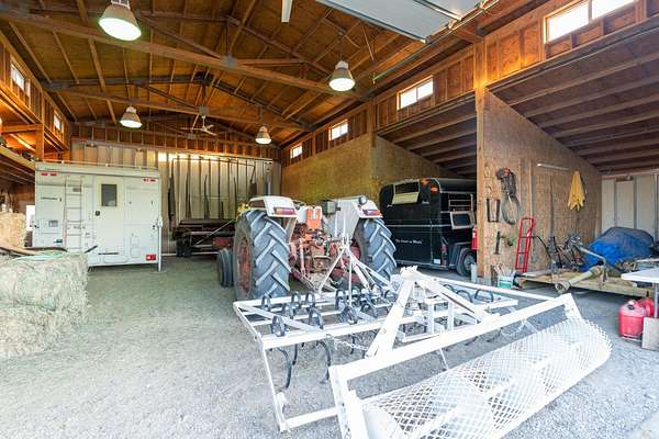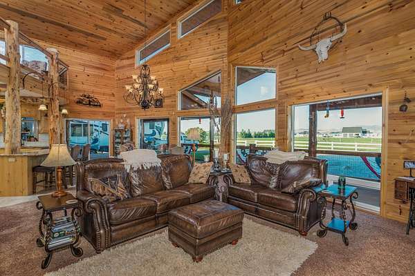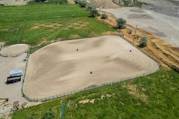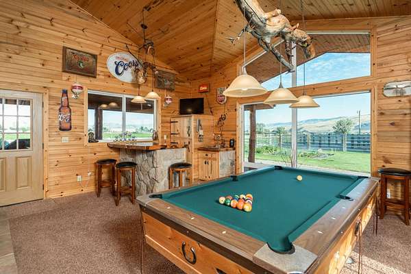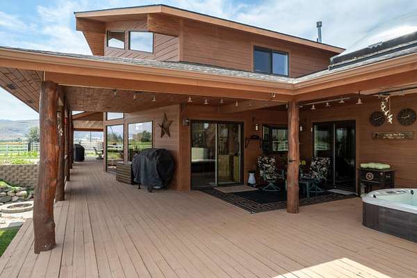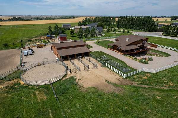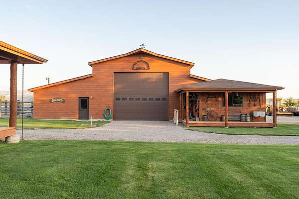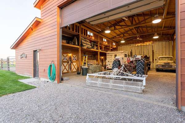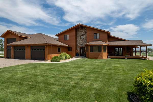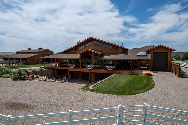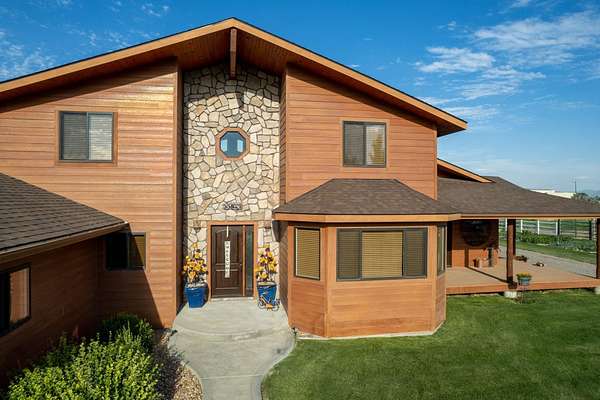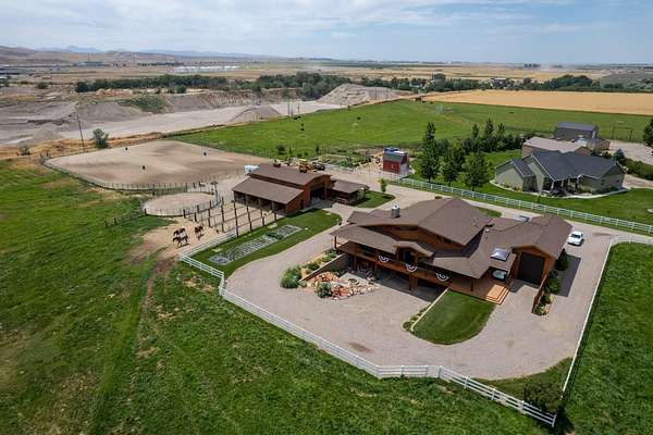 Incredible home offering main floor living with open, cathedral ceiling in enormous great room with pool/game area. Primary bedroom located off of kitchen and mud room with primary suite bathroom having heated floors and oversized, multi-head walk-in shower. Exterior exit from primary suite onto covered deck with hot tub a step away and access through exterior sliders back into the kitchen from covered deck area. This is a great flow. Attached RV garage bay is drive thru with circle drive on backside of property offering RV dump along the way providing ease with efficiency towing large trailers and RV’s. Walkout basement also has 2-car garage with adjacent wood working shop including a half bath. Outbuildings offer horse barn with stalls, temperature regulated tack room, and enclosed machine/welding shop. There are fenced areas for livestock, corrals, and riding arena with adjacent round pen, all with pressurized irrigation. This is an architect dream on functional land!