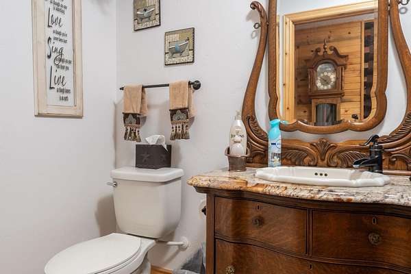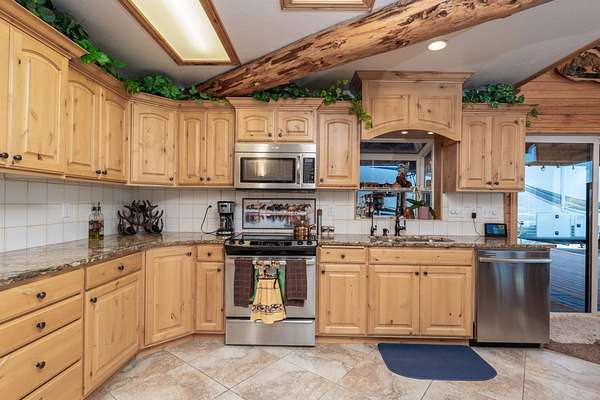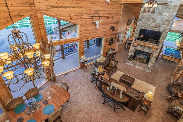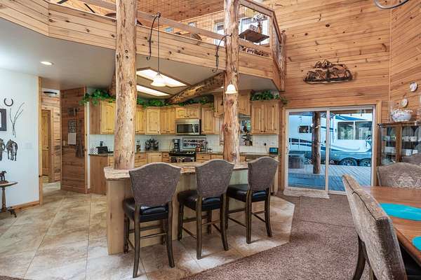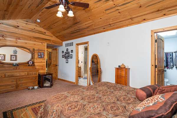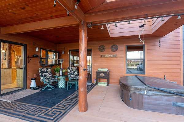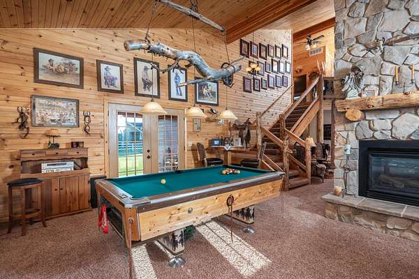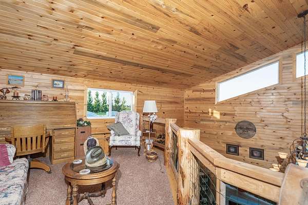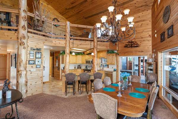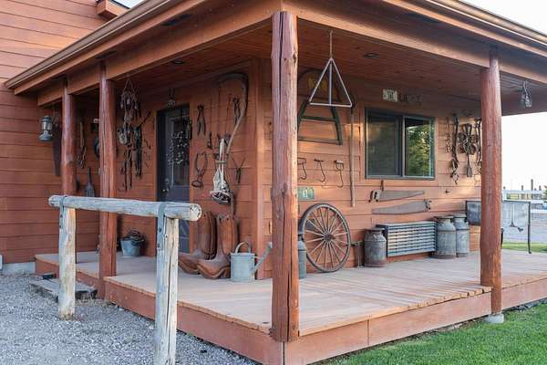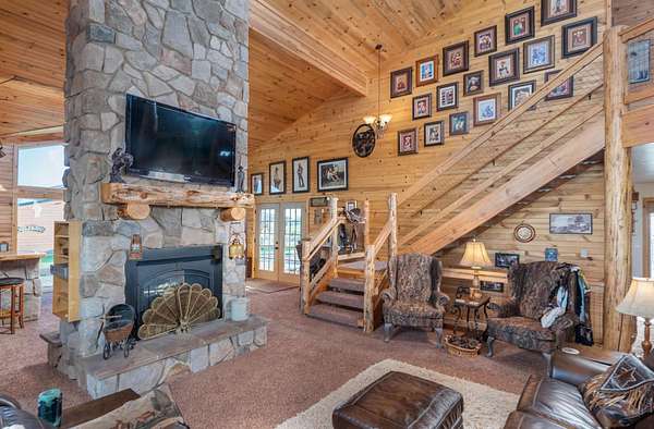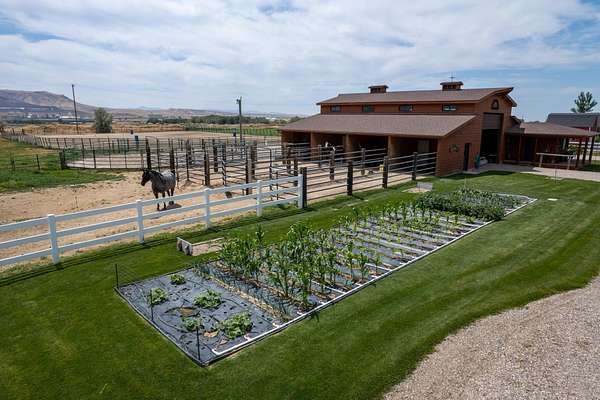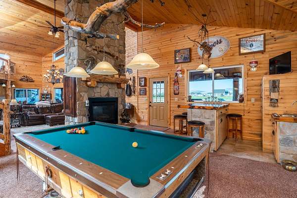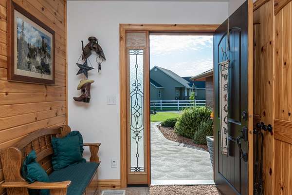 Incredible home offering main floor living with open, cathedral ceiling in enormous great room with pool/game area. Primary bedroom located off of kitchen and mud room with primary suite bathroom having heated floors and oversized, multi-head walk-in shower. Exterior exit from primary suite onto covered deck with hot tub a step away and access through exterior sliders back into the kitchen from covered deck area. This is a great flow. Attached RV garage bay is drive thru with circle drive on backside of property offering RV dump along the way providing ease with efficiency towing large trailers and RV’s. Walkout basement also has 2-car garage with adjacent wood working shop including a half bath. Outbuildings offer horse barn with stalls, temperature regulated tack room, and enclosed machine/welding shop. There are fenced areas for livestock, corrals, and riding arena with adjacent round pen, all with pressurized irrigation. This is an architect dream on functional land!