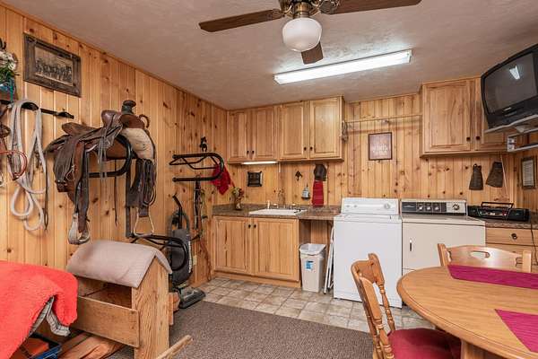 - Barn, Corral/Stable, Exterior Shop, Full, Hot Tub, RV Parking, Vinyl