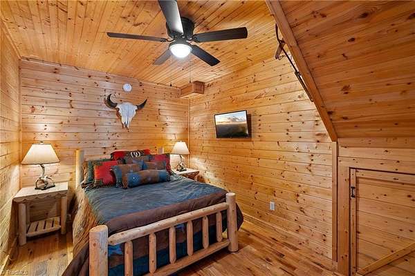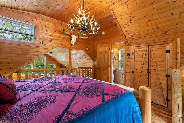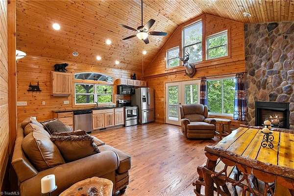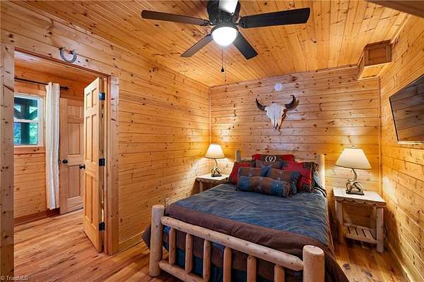 Furnished, turnkey cabin in the highly sought-after gated Buck Mountain community. 3,400 acre haven for ATV enthusiasts & nature lovers. Location offers ideal blend of accessibility & seclusion. Many outdoor entertaining spaces w/covered porch & multiple open decks. Great room welcomes you w/floor-to-ceiling stone fireplace. Convenient one-level living w/primary bedroom w/ensuite bathroom & main level laundry. Loft bedroom suite w/ensuite bathroom. Sun room is versatile serving as a gathering space, home office & cozy sleeping area. 12x20 outbuilding w/bar. The fire pit beckons for evening gatherings. Plenty of flat parking & usable, nearly level yard space. Near Blue Ridge Pkwy, 1 hr from Winston & 1 hr 40 min from Charlotte. Ideal for a weekend getaway. Long & short-term rentals are allowed. Buck Mtn offers hard to find amenities: ATV & Hiking Trails, Parks, Fish Pond, Waterfalls, Pavilions, Helipad & Community Ctr. Located 30 min from Boone, WJ & Wilkesboro. Fiber optic available.