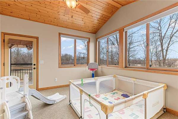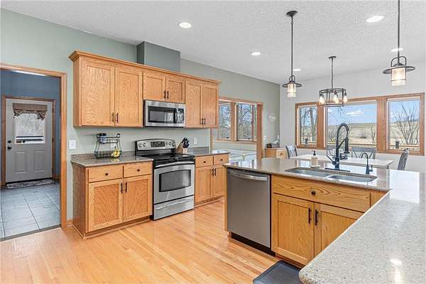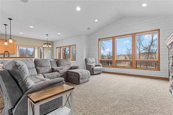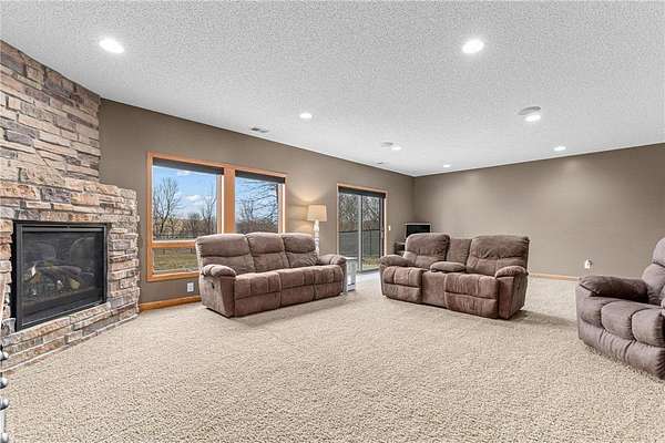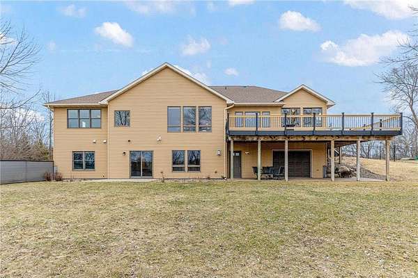 This stately and impressive custom built home in Lonsdale has a list of features to impress all. Positioned on over 2 1/4 acre lot in the rolling hills of Lonsdale; this walk out rambler welcomes you upon entry with vaulted ceilings, and expansive spaces framed by the western facing bay windows. Warm tone hardwood flooring, custom stone fireplace, and custom built ins. Open and spacious kitchen, 4 season sun room, den/office, and mud room, and main level laundry. To the rear you can enjoy over 650 square feet of deck overlooking the back yard. Two bedrooms up, including the expansive main level primary bedroom with ensuite including a soaker tub, separate shower, and large walk in closet. Lower level includes two additional bedrooms, ample storage, second custom stone fireplace, large family room with walk-out to the fenced in back yard, and private entry into the lower level 2 car garage / entertaining area! New roof in 2023, newer furnace, A/C, and kitchen appliances. Well maintained, private, spacious, and an easy commute to I-35. On market Friday 03/20.