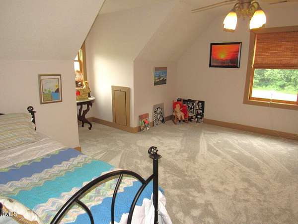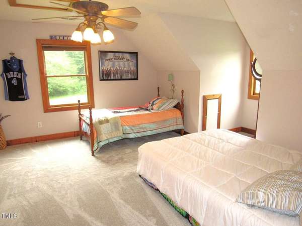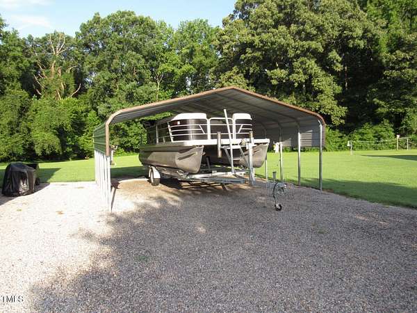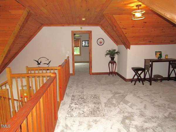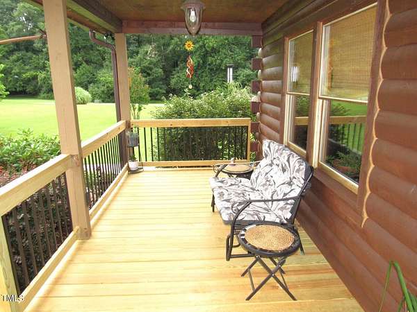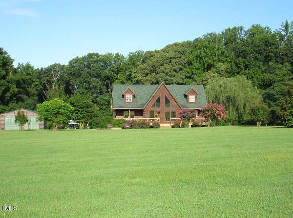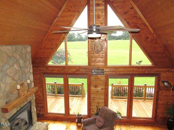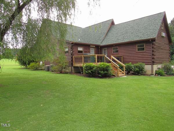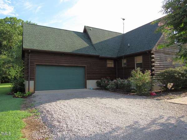 Beautiful traditional log-style home offering 2,700+ sqft on 2 unrestricted acres! ONLY 2 miles - to KERR LAKE - boat ramp at Flemingtown Rd, 4 miles to Satterwhite Point and Nutbush boating ramps! Enjoy the charm of a 28' open front porch and two 16x8 covered porches, perfect for relaxing or entertaining. Inside, you'll find Knotty Pine wood throughout giving the home a warm, rustic feel. The spacious family room features a soaring 20' ceiling, floor-to-ceiling stone gas log fireplace, and a spiral staircase leading to a loft with balcony views. The open kitchen and dining area includes a tile backsplash, center island with breakfast bar, and generous counter space for meal prep and hosting, and all appliances will stay. Main level offers 3 bedrooms, including a large primary suite with jetted tub, walk-in closet, and private bath. Upstairs features 2 additional bedrooms, a full bath, and an open loft area. Additional features include a firepit, side-entry garage with finished attic space (not in heated sqft), a detached 30x30 garage with 10x10 doors, 21x20 carport, and a 16x12 storage shed. MUST SEE!