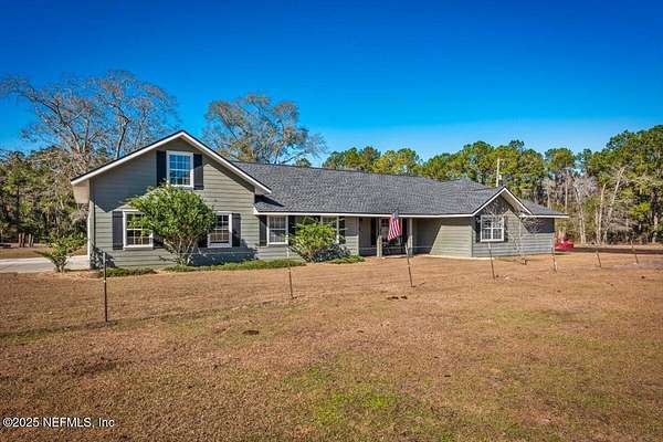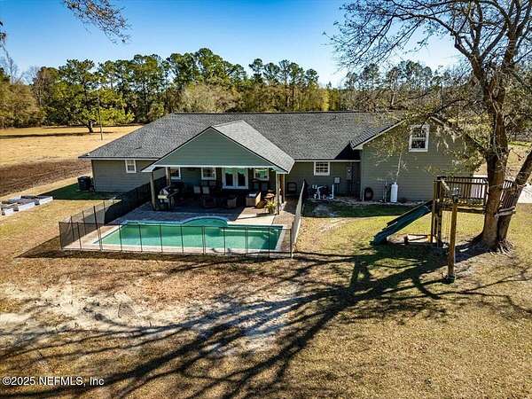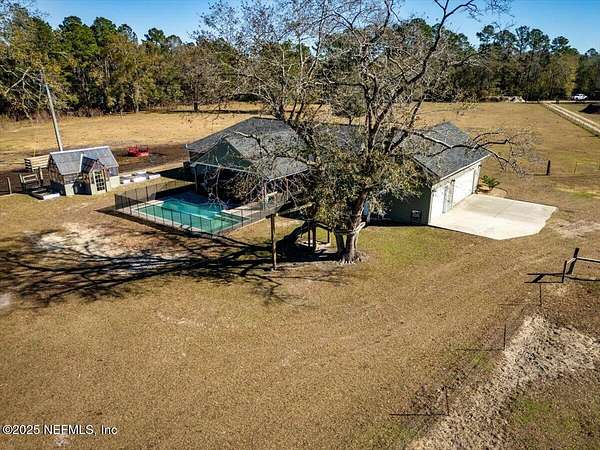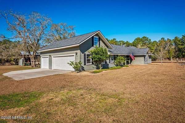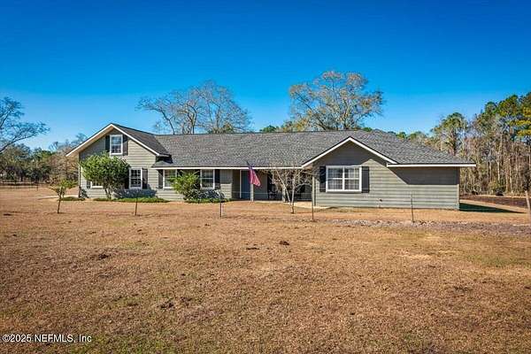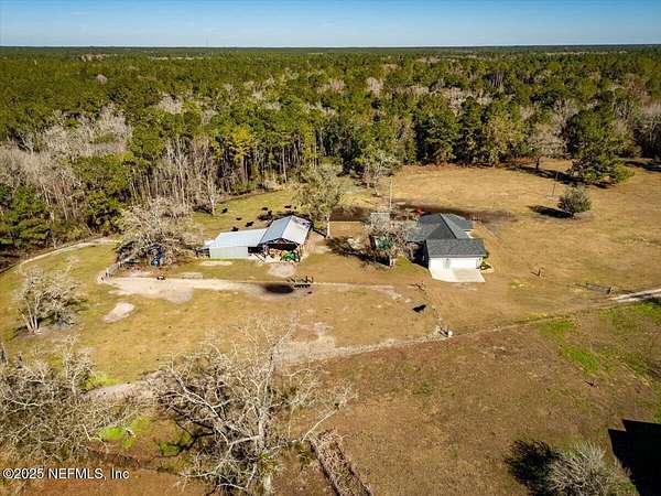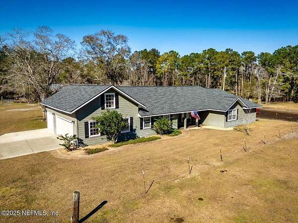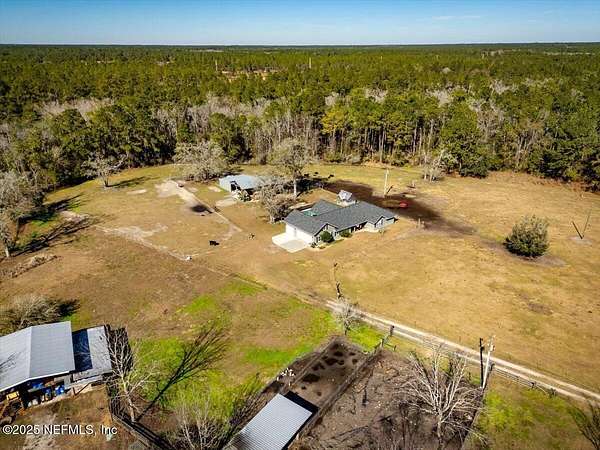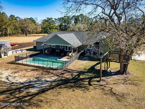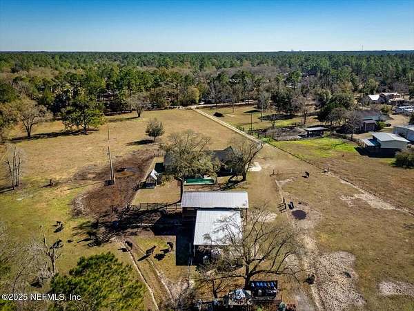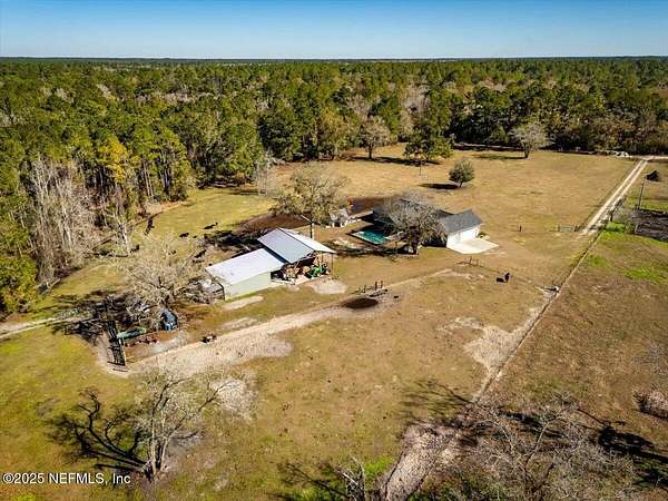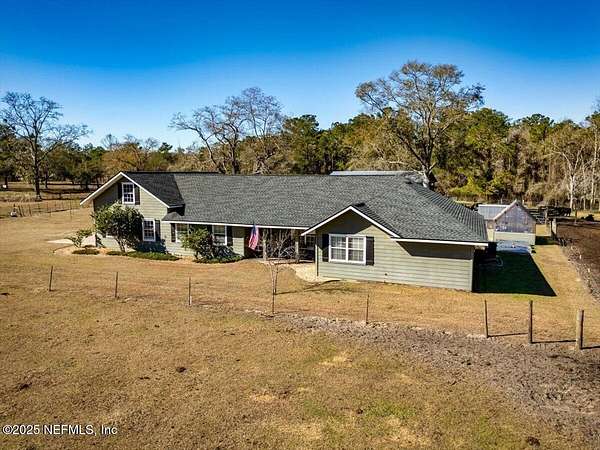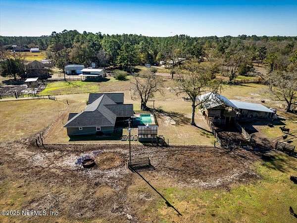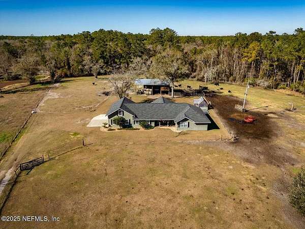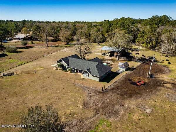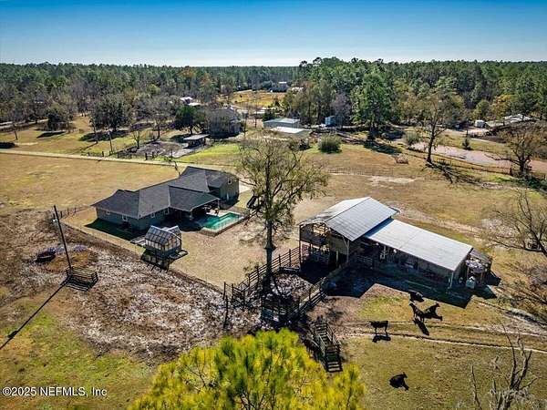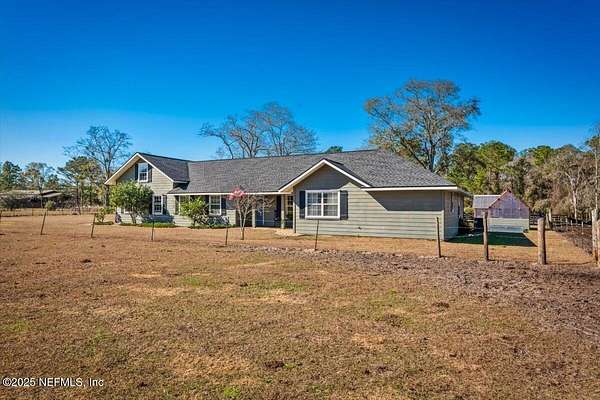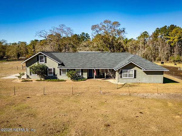 Secluded, country living, still only minutes from HWY 301 in Bryceville. This 3-bedroom, 2.5-bathroom farm style pool home is perfectly situated on 10 acres mostly cleared with divided pastures and opportunities to expand. Step from the welcome mat into an interior embrace that includes antique pine hardwood flooring and an open layout including spacious kitchen, living room, and office. Premium stainless steel appliances and granite counters with tile backsplash make for an inspiring kitchen environment. The kitchen opens seamlessly onto the living room. Primary suite comes with a walk-in closet and large walk in shower. The other two bedrooms, conveniently accessible are ready for styling. Approximate 500-600sqft unfinished suite located above the garage. Attached 3 car garage. The exterior includes tranquil inground pool and a breezy back porch. Also included is the oversized barn with workshop. Enjoy the spectacular views. It's going to feel great to call this place home.