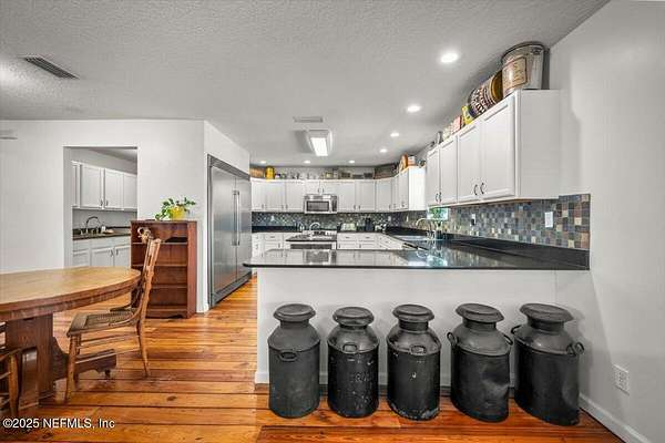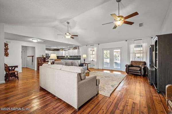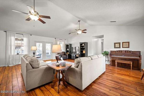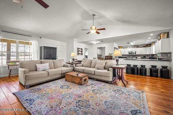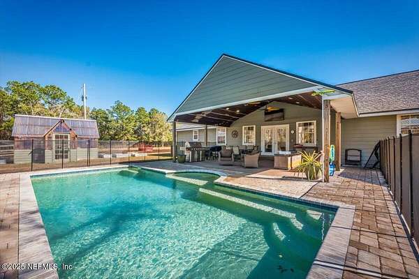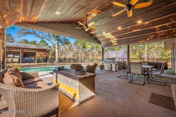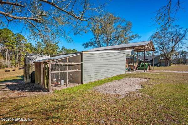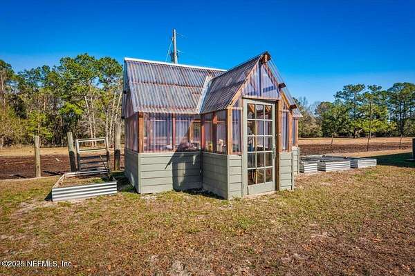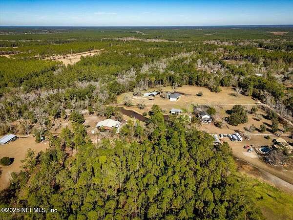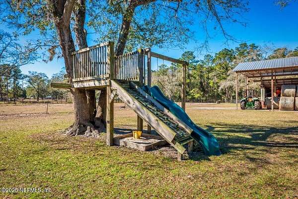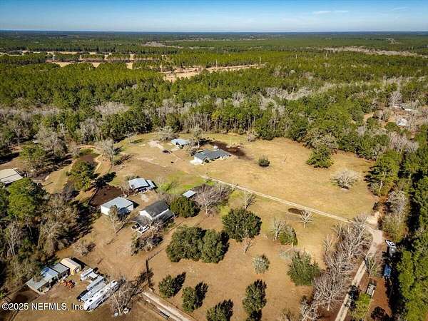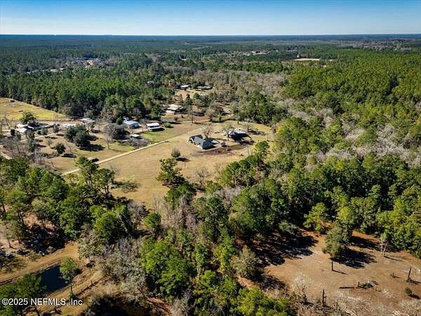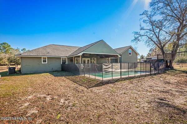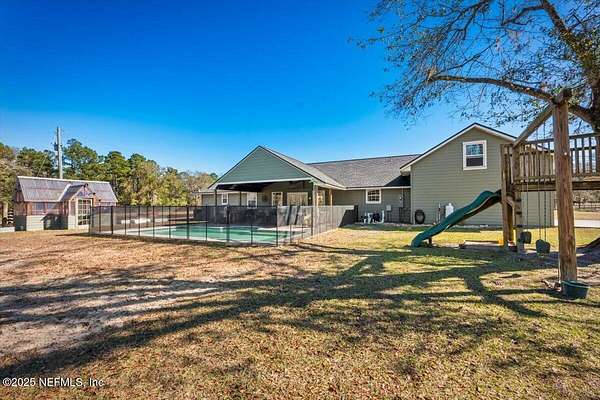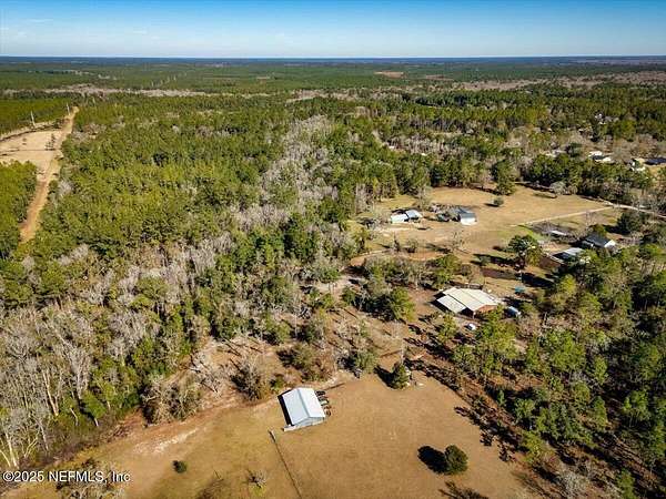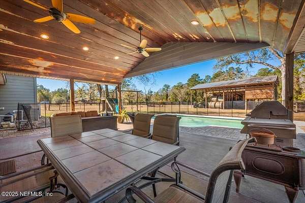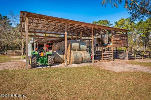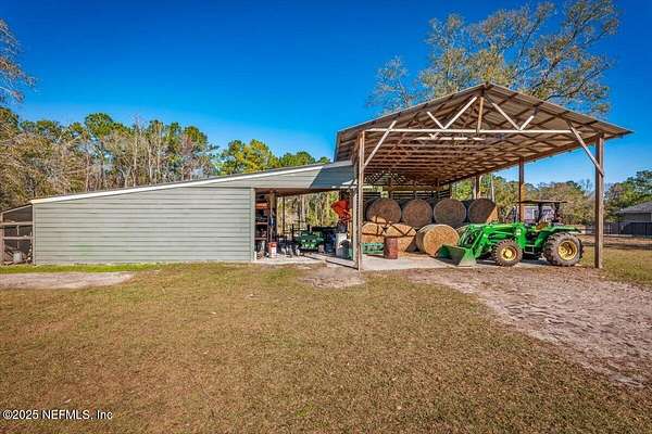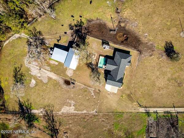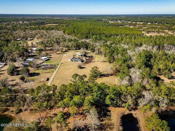 Secluded, country living, still only minutes from HWY 301 in Bryceville. This 3-bedroom, 2.5-bathroom farm style pool home is perfectly situated on 10 acres mostly cleared with divided pastures and opportunities to expand. Step from the welcome mat into an interior embrace that includes antique pine hardwood flooring and an open layout including spacious kitchen, living room, and office. Premium stainless steel appliances and granite counters with tile backsplash make for an inspiring kitchen environment. The kitchen opens seamlessly onto the living room. Primary suite comes with a walk-in closet and large walk in shower. The other two bedrooms, conveniently accessible are ready for styling. Approximate 500-600sqft unfinished suite located above the garage. Attached 3 car garage. The exterior includes tranquil inground pool and a breezy back porch. Also included is the oversized barn with workshop. Enjoy the spectacular views. It's going to feel great to call this place home.