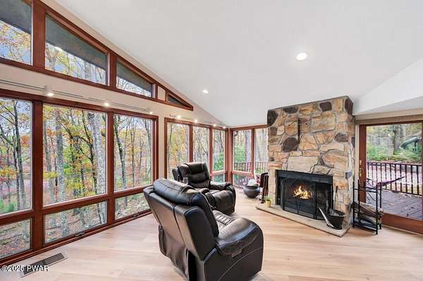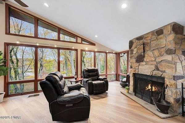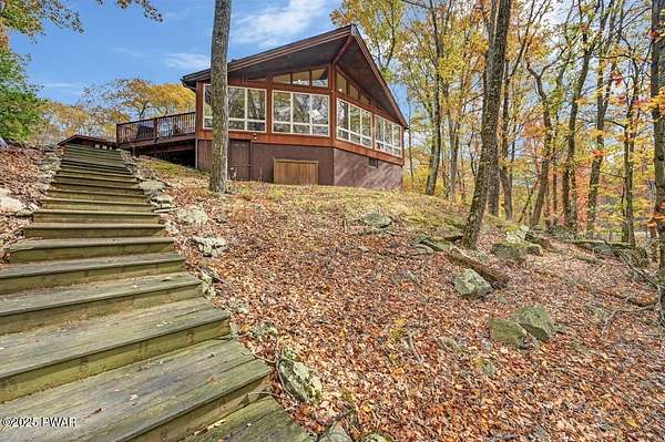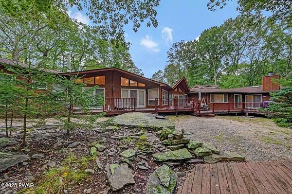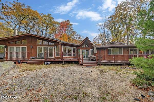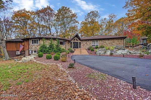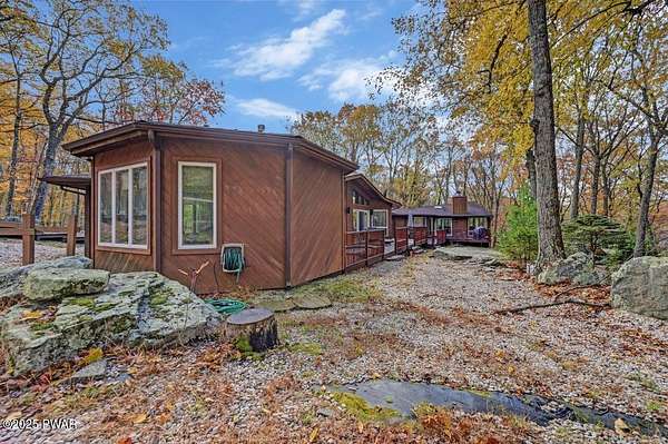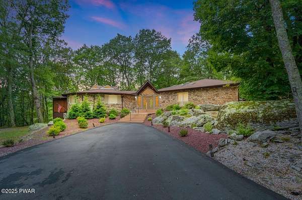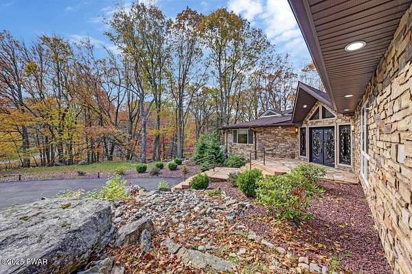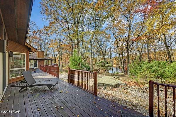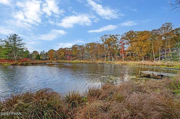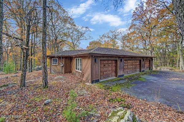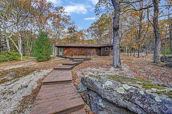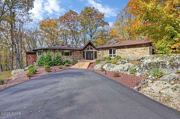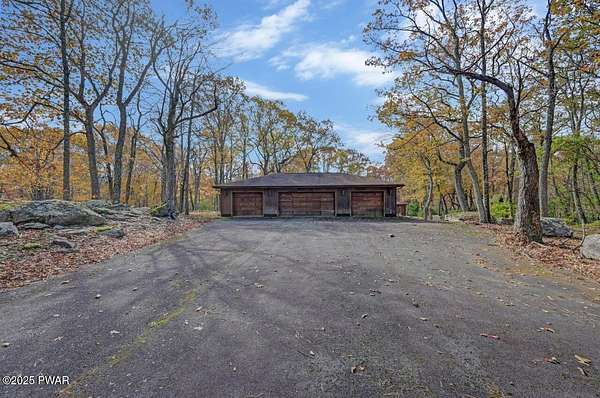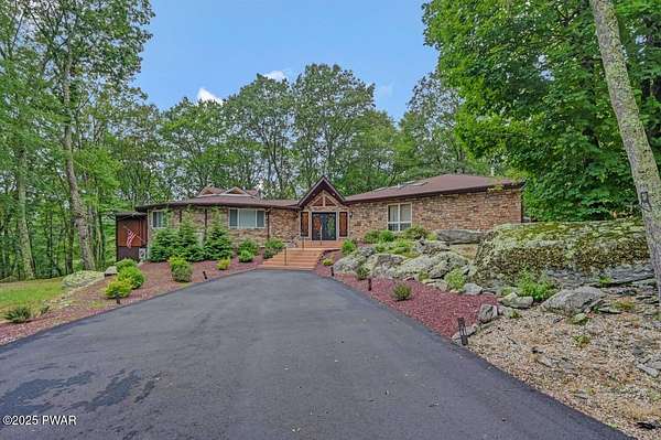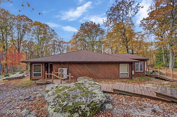 Welcome to 116 Broadmoor Drive, Hemlock FarmsWhere art, architecture, and nature live in harmony. This striking contemporary ranch rests on 3.4 private acres with pond frontage, peaceful lake views, and direct access to Little Camp Beach. Step inside, and you'll instantly feel the connection to nature--expansive windows invite the outside in, filling the open floor plan with natural light and framing the forest and water views like living artwork. Designed for both style and serenity, the home's flowing layout features a bright living room with a stone fireplace, a modern kitchen with an adjoining dining area, and a family room perfect for entertaining. The primary suite is a showpiece in itself, featuring a rare free-hanging fireplace--originally showcased at the Guggenheim Museum--along with a luxurious ensuite bath complete with a Jacuzzi tub and steam shower giving it a spa-like feel. Two additional bedrooms on the main level and one additional sleeping area on the lower level offer comfort and versatility for family or guests. Outside, the landscape feels like your own private retreat. Enjoy morning coffee on the deck, an afternoon paddle, or sunset walks to Little Camp Beach just beyond your property. A four-car detached garage with workshop space makes room for hobbies, art, or a car collection. With the adjacent lot included, you gain even more privacy, expansion potential, or simply space to breathe. Located in the amenity-rich Hemlock Farms community, you'll have access to lakes, indoor pool, outdoor pools, fitness centers, tennis & pickleball courts, and a vibrant year-round social scene. .At 116 Broadmoor Drive, contemporary design meets the timeless beauty of the Poconos--a true sanctuary for those who appreciate light, art, and the luxury of nature.