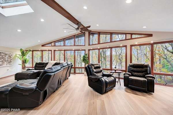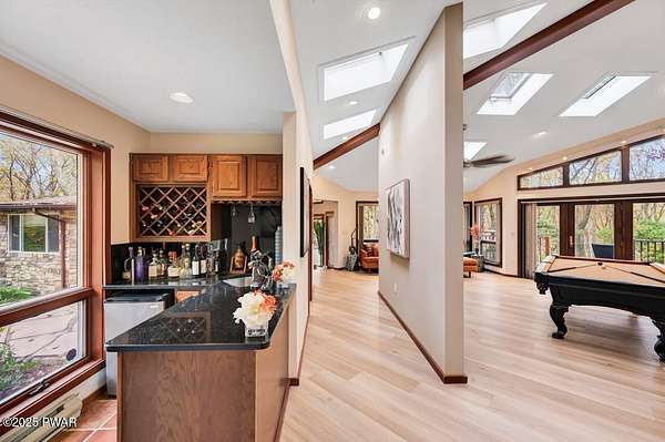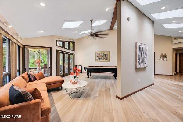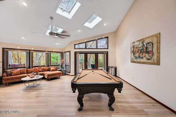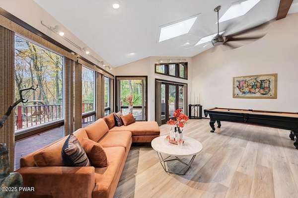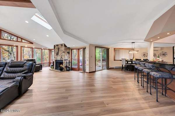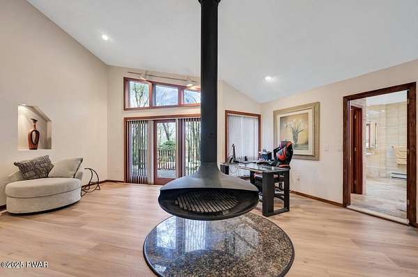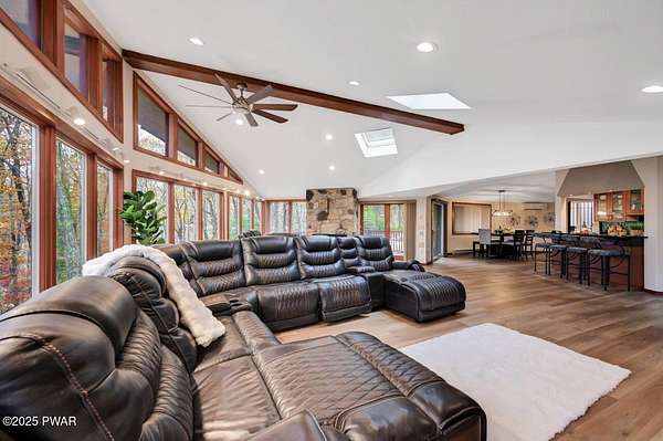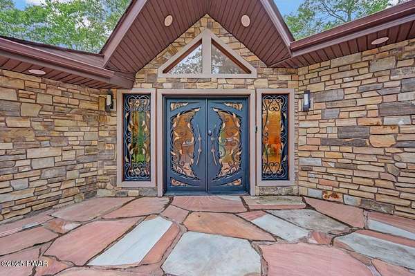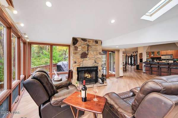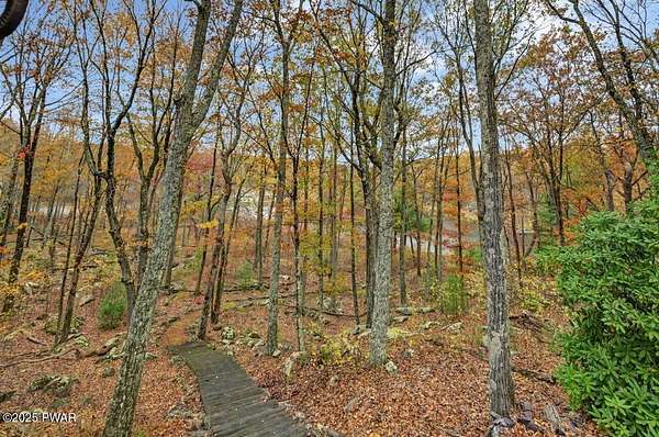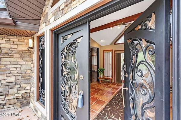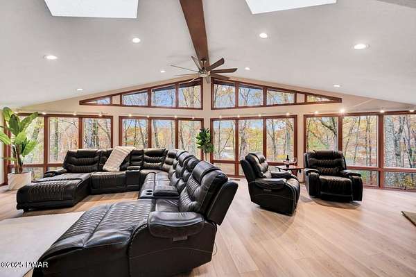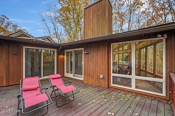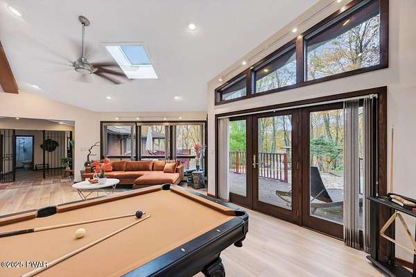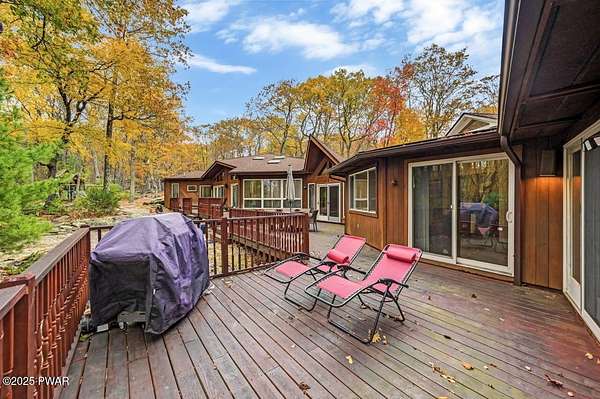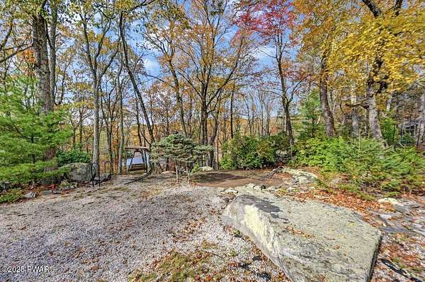 Welcome to 116 Broadmoor Drive, Hemlock FarmsWhere art, architecture, and nature live in harmony. This striking contemporary ranch rests on 3.4 private acres with pond frontage, peaceful lake views, and direct access to Little Camp Beach. Step inside, and you'll instantly feel the connection to nature--expansive windows invite the outside in, filling the open floor plan with natural light and framing the forest and water views like living artwork. Designed for both style and serenity, the home's flowing layout features a bright living room with a stone fireplace, a modern kitchen with an adjoining dining area, and a family room perfect for entertaining. The primary suite is a showpiece in itself, featuring a rare free-hanging fireplace--originally showcased at the Guggenheim Museum--along with a luxurious ensuite bath complete with a Jacuzzi tub and steam shower giving it a spa-like feel. Two additional bedrooms on the main level and one additional sleeping area on the lower level offer comfort and versatility for family or guests. Outside, the landscape feels like your own private retreat. Enjoy morning coffee on the deck, an afternoon paddle, or sunset walks to Little Camp Beach just beyond your property. A four-car detached garage with workshop space makes room for hobbies, art, or a car collection. With the adjacent lot included, you gain even more privacy, expansion potential, or simply space to breathe. Located in the amenity-rich Hemlock Farms community, you'll have access to lakes, indoor pool, outdoor pools, fitness centers, tennis & pickleball courts, and a vibrant year-round social scene. .At 116 Broadmoor Drive, contemporary design meets the timeless beauty of the Poconos--a true sanctuary for those who appreciate light, art, and the luxury of nature.