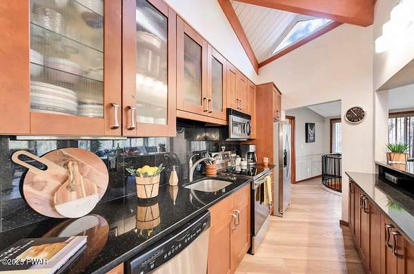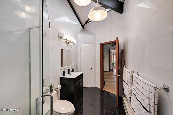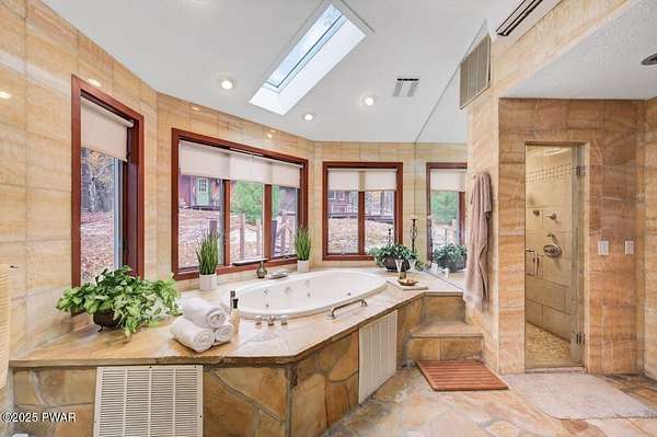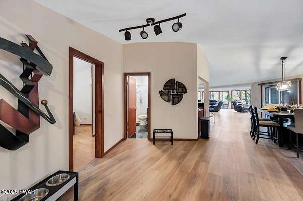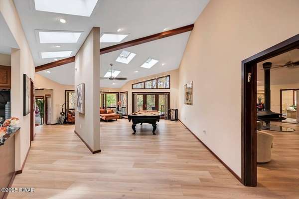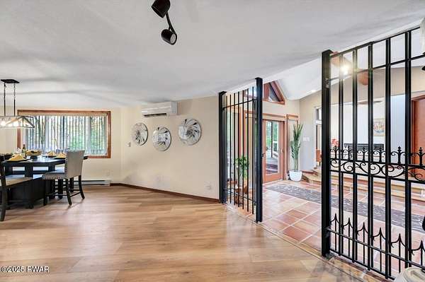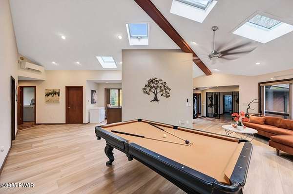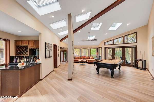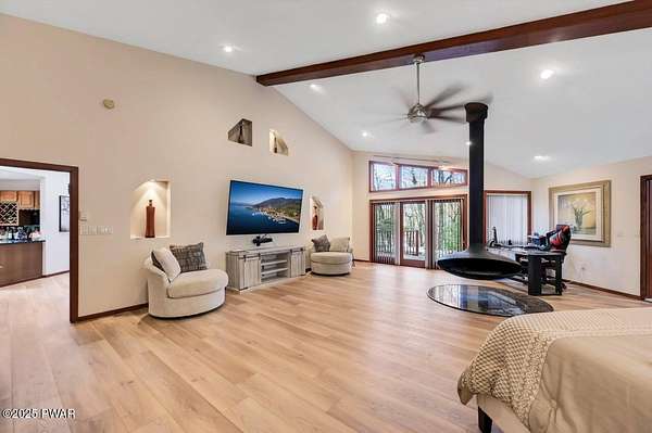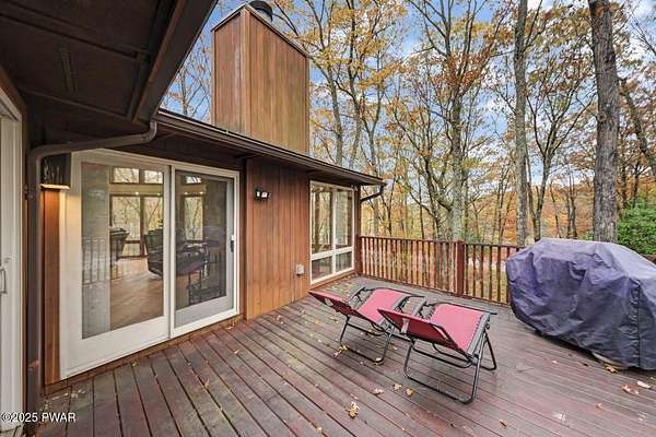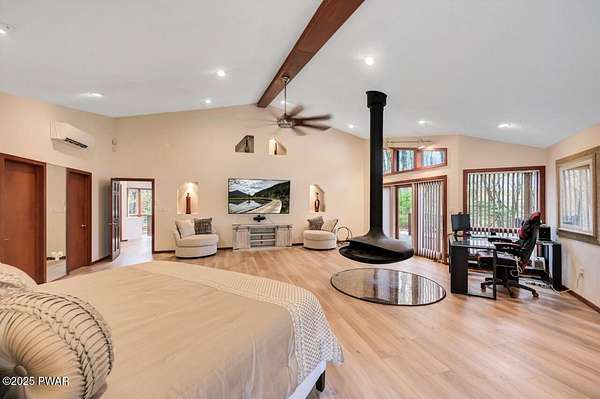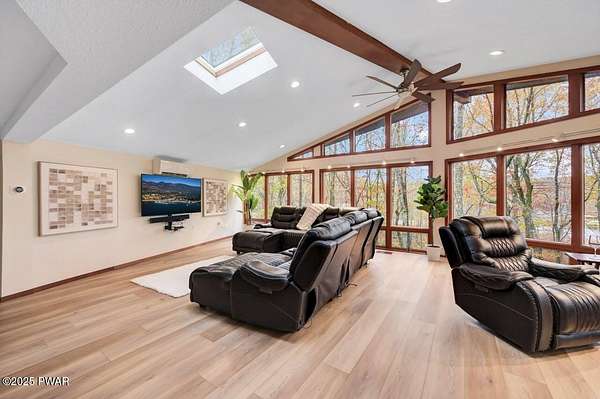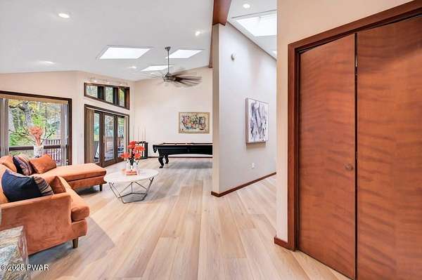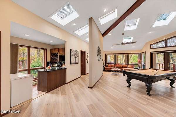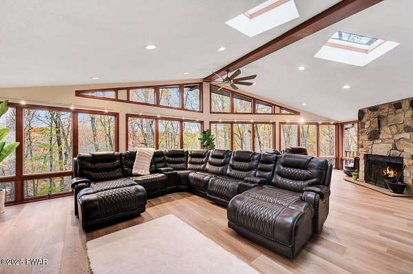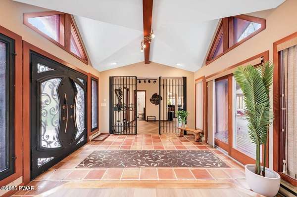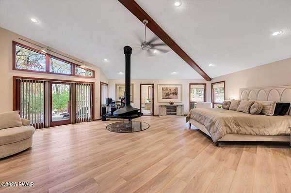 Welcome to 116 Broadmoor Drive, Hemlock FarmsWhere art, architecture, and nature live in harmony. This striking contemporary ranch rests on 3.4 private acres with pond frontage, peaceful lake views, and direct access to Little Camp Beach. Step inside, and you'll instantly feel the connection to nature--expansive windows invite the outside in, filling the open floor plan with natural light and framing the forest and water views like living artwork. Designed for both style and serenity, the home's flowing layout features a bright living room with a stone fireplace, a modern kitchen with an adjoining dining area, and a family room perfect for entertaining. The primary suite is a showpiece in itself, featuring a rare free-hanging fireplace--originally showcased at the Guggenheim Museum--along with a luxurious ensuite bath complete with a Jacuzzi tub and steam shower giving it a spa-like feel. Two additional bedrooms on the main level and one additional sleeping area on the lower level offer comfort and versatility for family or guests. Outside, the landscape feels like your own private retreat. Enjoy morning coffee on the deck, an afternoon paddle, or sunset walks to Little Camp Beach just beyond your property. A four-car detached garage with workshop space makes room for hobbies, art, or a car collection. With the adjacent lot included, you gain even more privacy, expansion potential, or simply space to breathe. Located in the amenity-rich Hemlock Farms community, you'll have access to lakes, indoor pool, outdoor pools, fitness centers, tennis & pickleball courts, and a vibrant year-round social scene. .At 116 Broadmoor Drive, contemporary design meets the timeless beauty of the Poconos--a true sanctuary for those who appreciate light, art, and the luxury of nature.