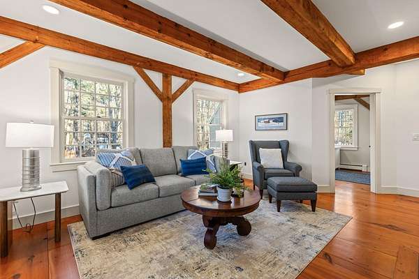 Gracefully positioned along 165 feet of pristine Piscataqua River frontage, this exceptional custom-built expanded Cape presents a rare opportunity where timeless craftsmanship meets refined waterfront living. Set on nearly five private acres, the approach via a circular driveway immediately establishes a sense of seclusion and arrival. From the inviting wraparound back porch, enjoy peaceful moments immersed in natural beauty and an atmosphere of understated luxury. Inside, a striking post-and-beam architectural design anchors the home, highlighted by dramatic vaulted ceilings and meticulous craftsmanship that define the expansive yet inviting living spaces. The grand living room offers warmth and character with a wood-burning fireplace, perfectly scaled for entertaining while framing tranquil river views. The modern chef's kitchen is thoughtfully curated with refined finishes, generous prep space, and a walk-in pantry, seamlessly supporting both everyday living and elegant gatherings. A dedicated laundry room enhances convenience. The home features three well-appointed bedrooms, two and one-half baths, and a private office or study ideal for today's luxury lifestyle. The serene primary suite is a true retreat, complete with one of the home's three fireplaces, adding comfort and ambiance. A carefully considered layout balances openness with intimacy, creating a residence that feels both grand and welcoming. Outdoors, the property's riverfront setting is further enhanced by a seasonal floating dock, offering direct access to the Piscataqua River for boating, kayaking, and waterfront enjoyment throughout the warmer months. Completing the estate is a three-car garage with additional space above, providing for future possibilities or creative use. An extraordinary riverfront offering of this caliber--where craftsmanship, privacy, land, and location converge--rarely becomes available so don't miss your chance!