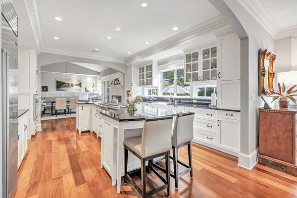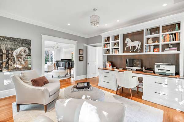 Tucked away on a picturesque property with a peaceful pond and complete privacy, this custom-built home is truly exceptional. From the moment you step onto the welcoming front porch, you'll feel the warmth and quality throughout. The sunlit kitchen is beautifully appointed with top-of-the-line appliances and a built-in banquette by the cozy fireplace, opening seamlessly to the inviting family room with a stunning fireplace & French doors to the patio. Entertain effortlessly in the elegant dining room w/ butler's pantry & spacious living room. A first-floor office w/ pocket doors offers a quiet retreat for work or study. Upstairs, the primary suite is a sanctuary w/ vaulted ceilings, a private sitting room, balcony overlooking the pond, and a luxurious spa-like bath. Three additional bedrooms, two full baths, & a bright laundry room complete the second floor. A private three-room suite off a separate entrance - including a family area, bedroom, full bath, and loft - provides perfect flexibility for guests, in-laws, or family members. The lower level offers a gym, full bath & sauna for healthy living. Outside, enjoy a resort-like lifestyle with a stunning 50-foot pool w/auto cover, mature landscaping, and breathtaking gardens. Set on 2.69 beautifully landscaped acres in a premier multi-million-dollar neighborhood convenient to everything beautiful Westport offers. This special home presents the perfect blend of elegance, comfort, quality & natural beauty - a true masterpiece.