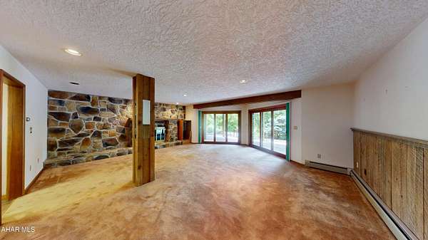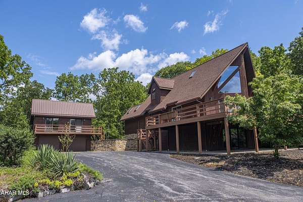 Welcoming and charming -this beautifully maintained, one-owner home sits on over 3 acres of peaceful land, offering unmatched privacy and stunning panoramic views. With a classic wrap-around deck and thoughtfully designed spaces both inside and out, this property is unique and a great opportunity to own a space with both comfort and versatility. Inside the main home, you'll find 3 spacious bedrooms and 3 full bathrooms, including a first-floor bedroom and bath. The living areas are surrounded by large windows that frame the scenic landscape, filling the home with natural light. The finished basement offers cozy, extra living space centered around a gorgeous stone fireplace and includes its own full bathroom-perfect for entertaining or unwinding. Additional features include: Newer central air system for year-round comfort Attached 1-car garage plus a circle driveway for easy access Detached 3-car garage with a spacious apartment above-complete with a full kitchen, dining room, large living room, full bathroom, and 1 bedroom. A perfect setup for guests, rental income, or a private home office.