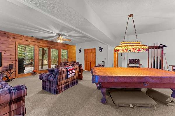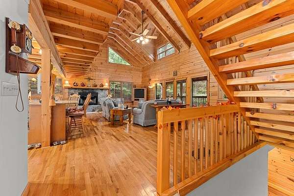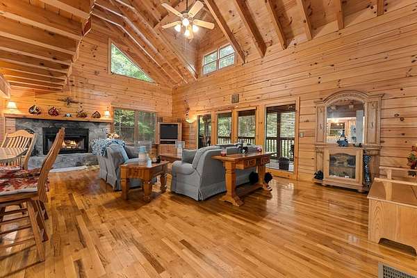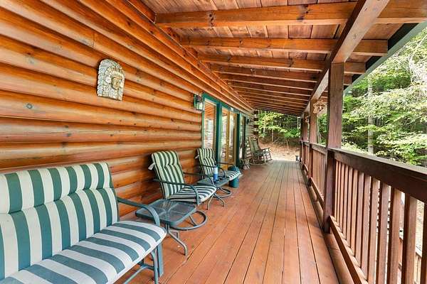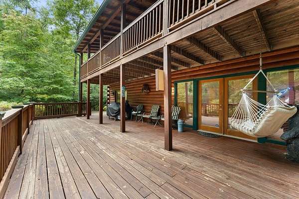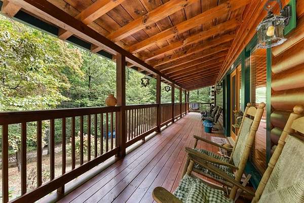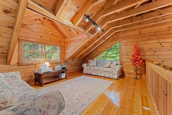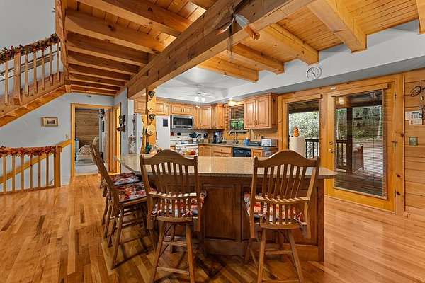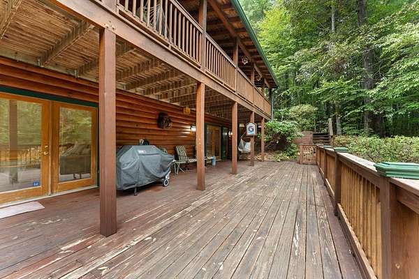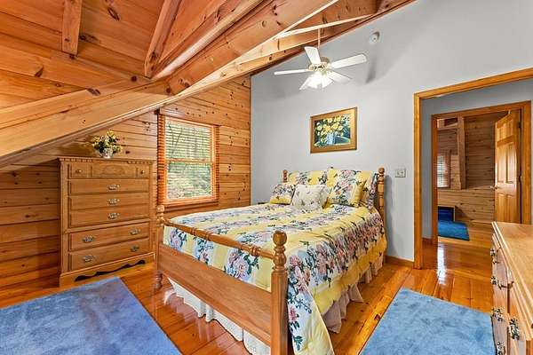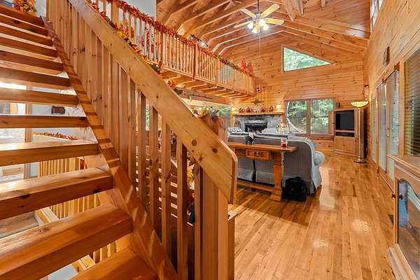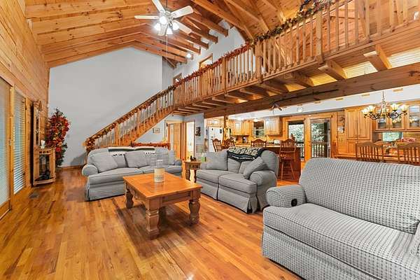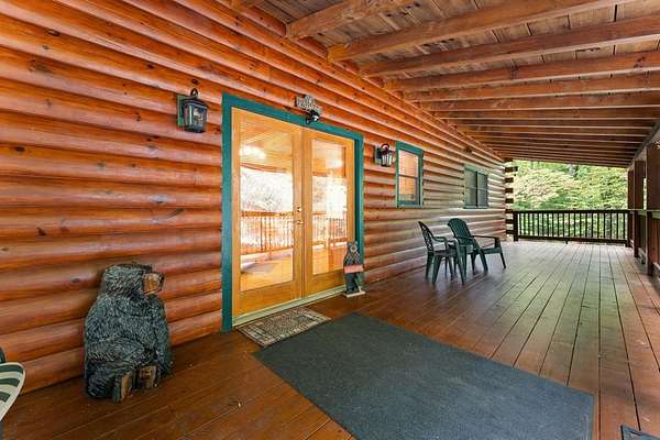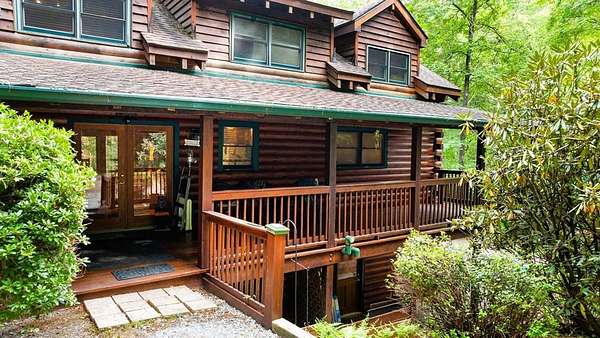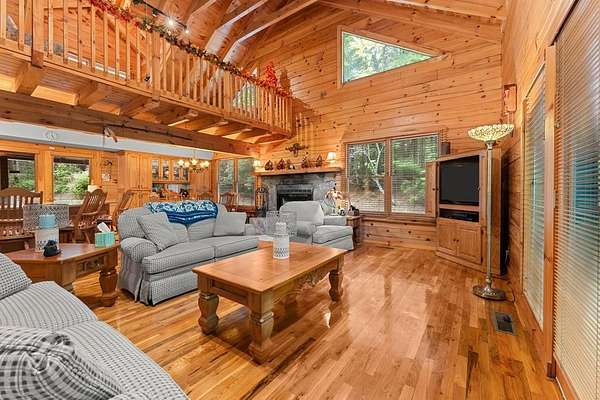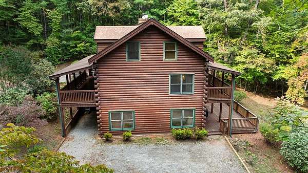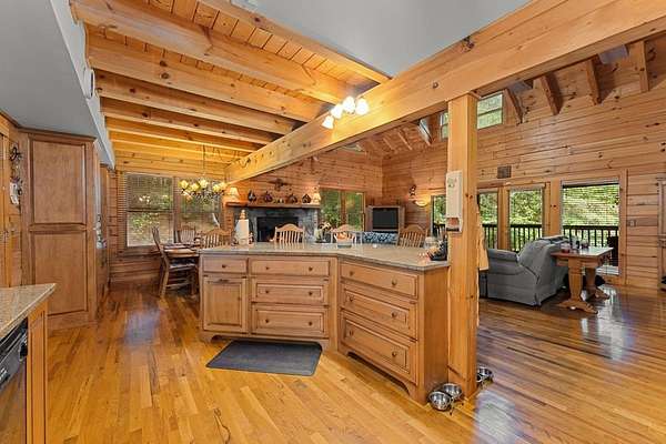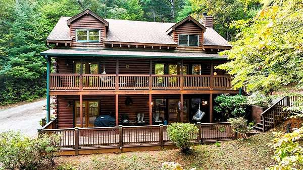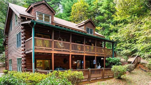 Beautiful furnished true D log cabin in excellent condition on 2.59 private acres, in an established subdivision of nice homes. This end of the road, 5-bed/3.5 bath custom home awaits its new owner. With front & back porches it offers plenty of places to relax & enjoy nature. Inside, the main floor has an open layout with hardwood floors. The living room features a vaulted wood-beamed ceiling & stone WB fireplace & opens to a large porch. The kitchen has custom cabinets, granite counters & a large breakfast bar. The main-level primary BR with an en-suite bath offers easy living. Upstairs, you'll find two bedrooms, a full bath, & a nice loft overlooking the living room. The lower level has a large family room with a pool table & bar that leads out to an oversized deck, that is great for entertaining. There's also 2 more bedrooms, full bath & laundry. Outside, a small pond with a old gazebo awaits you, that with a little TLC, it could be a wonderful spot to gather. The property has plenty of space for outdoor activities and is easily accessible, w/entry on both levels & no steep mountain roads to climb. It makes a perfect full-time residence, a relaxing getaway, or a vac. rental.