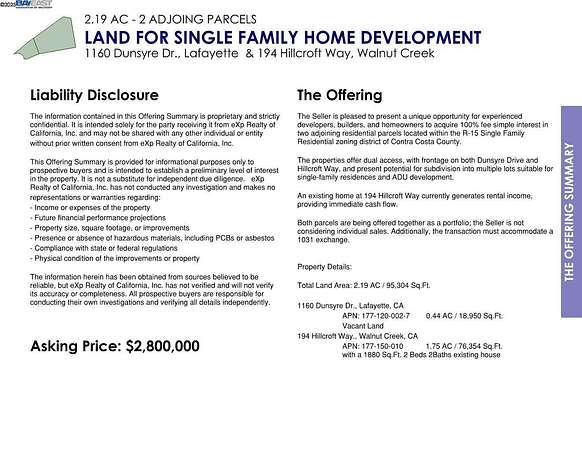 Est $3,338/moThis property is to be sold in conjunction with the adjoinng property at 194 Hillcroft Way, Walnut Creek as a portfolio. Two parcels accumulating 2.19 AC, with potential of building multiple single-family homes. Please review the listing of 194 Hillcroft Way, Walnut Creek for additional information. Additional reports, maps, plans available upon request.