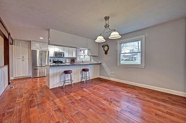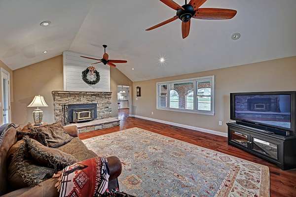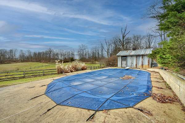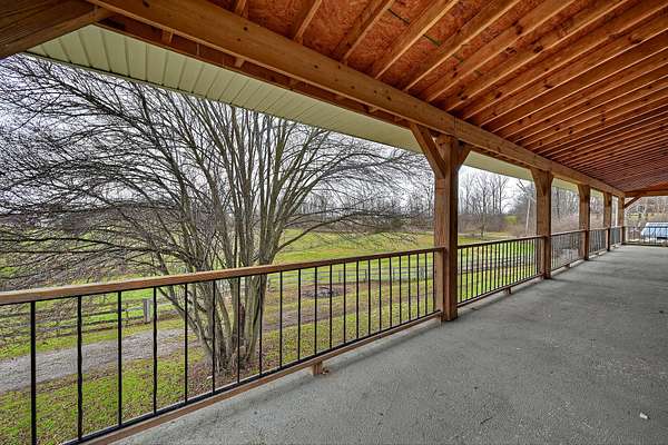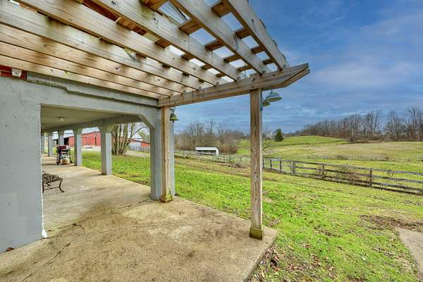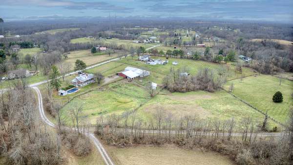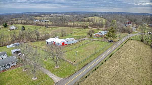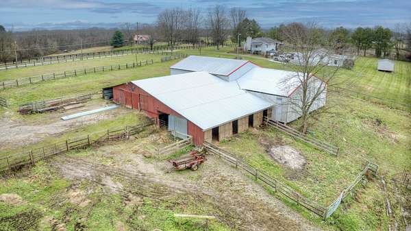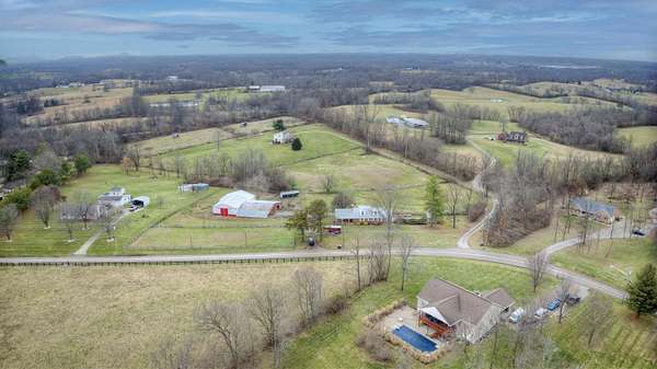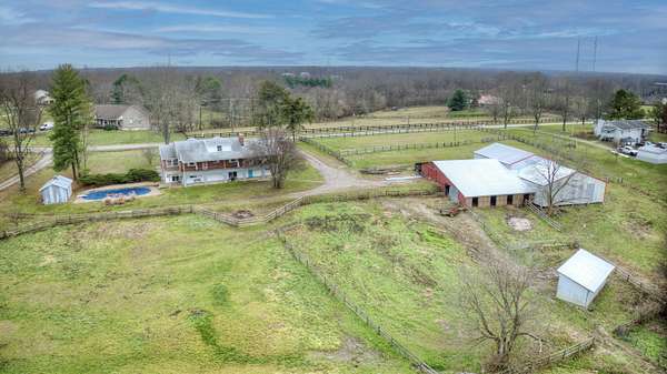 Mini Gentleman's Farm with endless possibilities on 5.77 Acres. Experience the perfect blend of country charm and everyday convenience with this exceptional all-brick Cape Cod, ideally located with easy access to I-75S and I-71S. Set on 5.77 picturesque acres, this one-of-a-kind property is ideal for horses, hobby farming, or a home-based business. The home offers 5 bedrooms and 4 full bathrooms, highlighted by a spacious, entertainer-friendly kitchen featuring granite countertops and custom upper cabinetry. Rich hardwood floors flow throughout, complemented by a custom staircase, columns, and headers, creating a warm, timeless feel. Cozy up by two wood-burning fireplaces-a stone fireplace in the Living Room and a brick fireplace in the Family Room. The Living Room also boasts a raised ceiling, adding to the home's open and airy appeal. The main-level primary suite includes a luxurious en-suite bath and walkout access to a peaceful sunroom. An additional main-floor bedroom and full bathroom provide flexibility for guests or home office needs. Custom solid alder wood doors with matching stain, a built-in pantry, and custom first- and second-floor bathrooms with Blue Pear granite flooring showcase the attention to detail throughout. The finished lower level expands the living space with a bedroom, full bathroom, kitchenette, and direct pool access through a fun bar area-perfect for entertaining. Outdoors, enjoy summer days by the in-ground pool, relax on the covered front porch, or unwind on the expansive 62' x 8' covered back porch overlooking rolling pastures and scenic grounds. Equestrians and hobbyists will love the impressive 7,000 sq ft detached barn/garage featuring 7 horse stalls, fenced pastures, a large lean-to, and even a car pit for the mechanic at heart. With quick possession available, abundant living and storage space, and thoughtful upgrades throughout, this mini farm is truly move-in ready and waiting for you to make it your own.