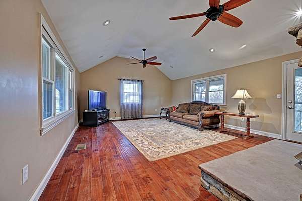 - Breakfast Bar, Built-In Features, Ceiling Fan(s), Chandelier, Dry Bar, Granite Counters, Master Downstairs, Natural Woodwork, Soaking Tub, Stone Counters, Vaulted Ceiling(s), Walk-In Closet(s)