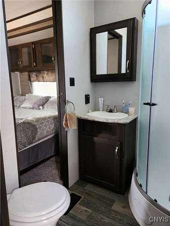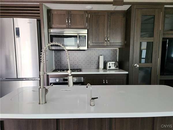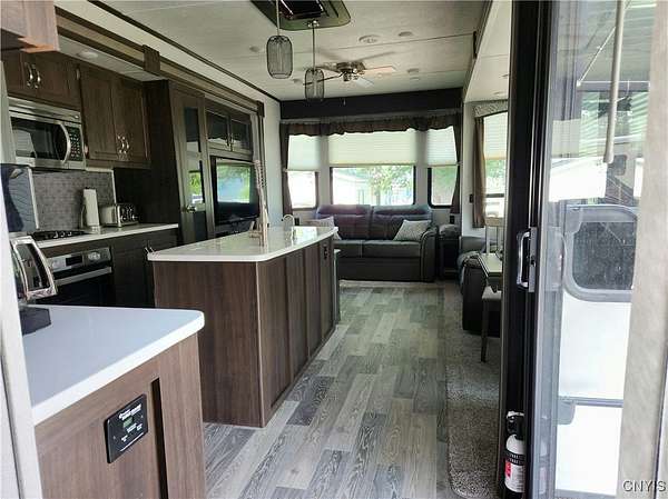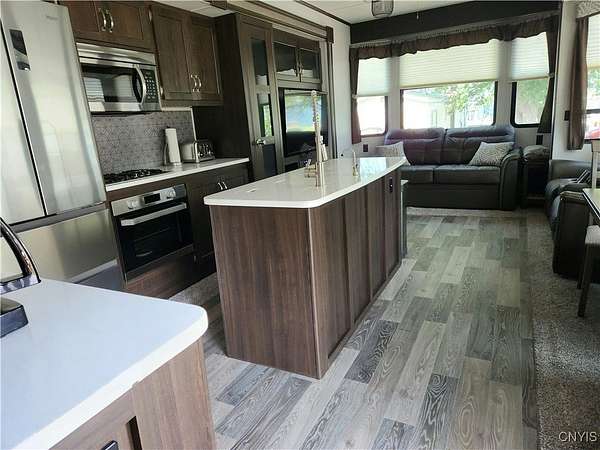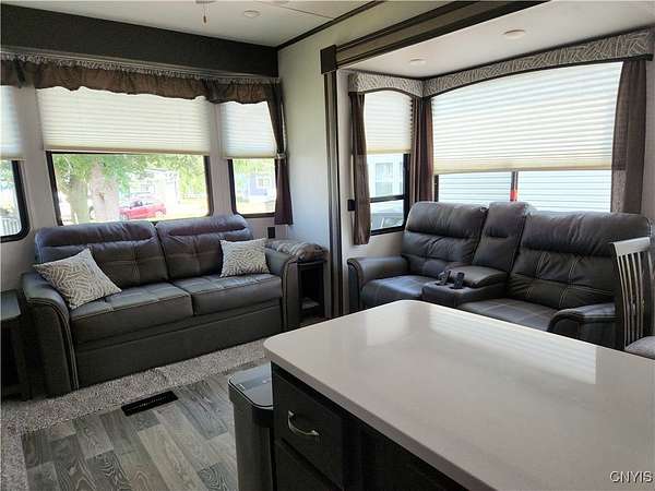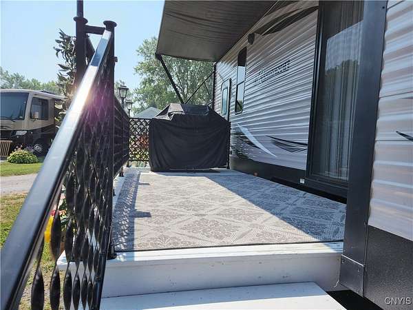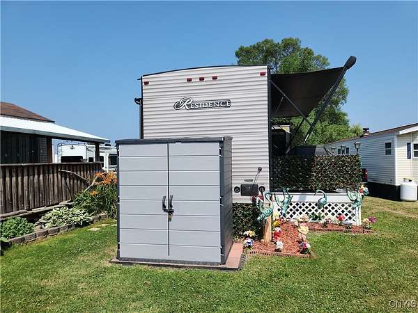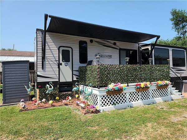 Turnkey Lakeside Retreat - A Lightly Used, Like-New Mobile Home on Henderson Bay, Lake Ontario Nestled on the serene shores of Henderson Bay, this fully furnished 1-bedroom, 1-bathroom mobile home offers a rare opportunity for a lakeside getaway. Perfectly situated in a peaceful, well-maintained RV resort community, this mobile home is an ideal choice for those seeking a turn-key vacation retreat or seasonal living. With its open-concept design, the home features a spacious living and kitchen area adorned with beautiful cabinetry, modern countertops, and stainless steel appliances. Enjoy year-round comfort with climate control provided by two central air units and a cozy electric fireplace. This unit is also equipped with a central vacuum system, a pull-out couch for extra sleeping space, and convenient washer/dryer hookups. The propane range ensures efficient cooking, while the electric fireplace adds warmth and ambiance to the living area. The exterior includes a paved patio, side deck with awning, and a storage shed, providing ample space to relax or entertain outdoors while enjoying stunning sunset views over the lake. Just steps from the water, this home offers private access to docks, a clubhouse, and on-site laundry facilities. The park's annual lease agreement of $3,250 covers essential services like public water, septic, and trash. As an added benefit, the resort also offers a rental pool program, allowing you to generate passive income when you're not using the property. Whether you're looking for a peaceful seasonal retreat or an investment property with rental income potential, this lakeside gem is ready for you to move in and start enjoying. Call today to schedule your private tour!