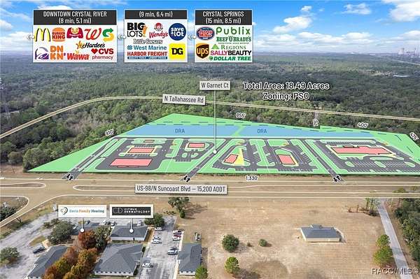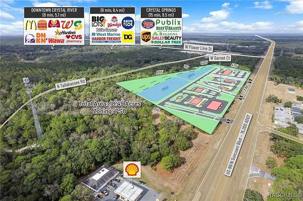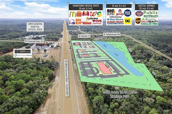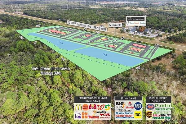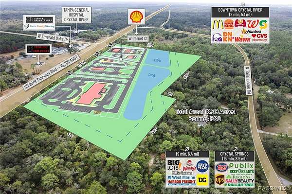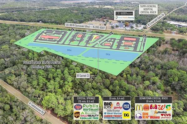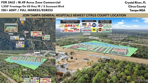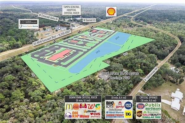 Presenting an exceptionally well-positioned 18.49-acre (8.13 Acres and 10.36 Acres purchase separately or together these ) commercial development sites situated along one of Crystal River's most strategic and rapidly evolving corridors. Predominantly zoned PSO (Professional Service/Office), this property features over 1,330 feet of high-visibility frontage on US Hwy 19 / S Suncoast Blvd (15,200 AADT)-a major north-south artery serving both local residents and regional traffic. The site offers full north- and south-bound ingress and egress through an existing deceleration lane and open median and the connective drive with the adjoining parcel, and will provide said access, providing seamless access and ideal positioning for high-intensity commercial development. Located within Crystal River's fast-emerging medical corridor, the property directly benefits from Tampa General Hospital's transformational 53-acre healthcare campus expansion, currently underway just minutes from the site. This major investment introduces a new 120-bed hospital tower, a 120,000-square-foot medical office building, and expanded specialty and outpatient services. The expansion is projected to significantly increase employment, healthcare demand, and regional traffic-effectively establishing this section of US 19 as the next major healthcare hub of the Tampa MSA. The surrounding corridor is already attracting operators seeking proximity to TGH, making this an ideal site for QSR with Drive-Thru, Gas Station, Bank, Hotel, Medical Office, Outpatient Facilities, Senior Living, and Multi-Family residential concepts. Its flexible zoning and strong demographic profile provide a nearly unmatched development canvas. Just south of Crystal River's Historic Downtown, the site is surrounded by a growing mix of local boutiques, restaurants, entertainment venues, and service-oriented businesses. The city is undergoing a surge of redevelopment, highlighted by the transformation of the former Crystal River Mall into a 400-unit residential community with integrated mixed-use retail, bringing a substantial increase in new residents and commercial activity. Additionally, the property directly abuts the rear boundary of the 85-acre Hidden Lake RV Resort, now under construction and planned to include 580 RV sites, creating immediate demand for convenience retail, hospitality, dining, medical services, and everyday goods. Citrus County's growth trajectory is among the strongest in the state. With a current population of 153,600 residents projected to exceed 350,000 by 2030 per the County's Land Development Code, the region is rapidly transitioning into a major population and service center. Its inclusion in the Tampa-St. Petersburg-Clearwater MSA, the 18th largest in the United States, further enhances its long-term strength and desirability for business expansion, new housing supply, and healthcare delivery.