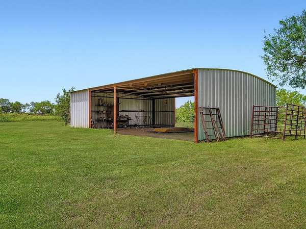 This property embodies the true spirit of Texas ranching, a lifestyle deeply rooted in tradition and heritage. Feel the echoes of generations who have worked the land, nurtured livestock, and found solace in the breathtaking landscapes. From cowboy culture to rodeos, to BBQs, ranch life offers a unique glimpse into a way of life that is quintessentially Texan. The home has been "newly refurbished" and "remodeled," including a new heating and air conditioning system, new double-pane windows, flooring, doors, modern cabinetry, all-new walls, and insulation; the list goes on. Nestled among lush greenery and a vibrant lawn, the home boasts a well-defined and secure outdoor space, featuring a separate gated grass area. At the entrance, you will see a separate metal storage. Next door stands a charming dwelling, a craftsman's haven. On the ground floor, a spacious carpenter's dream workshop unfolds, and above it is a comfortable living space, perhaps a loft-style apartment or a carriage house apartment. In the back area sits a tall and wide metal barn with convenient double-sided access.