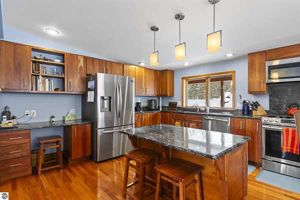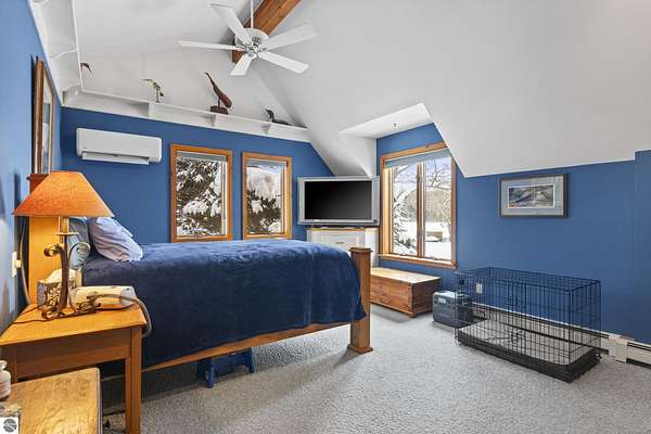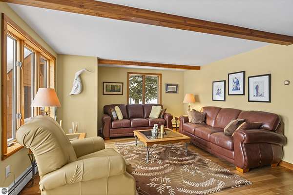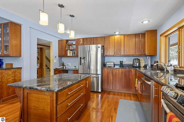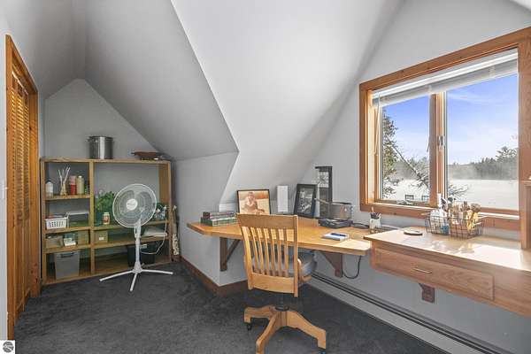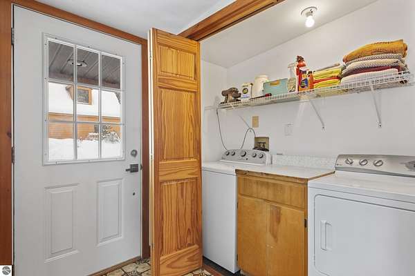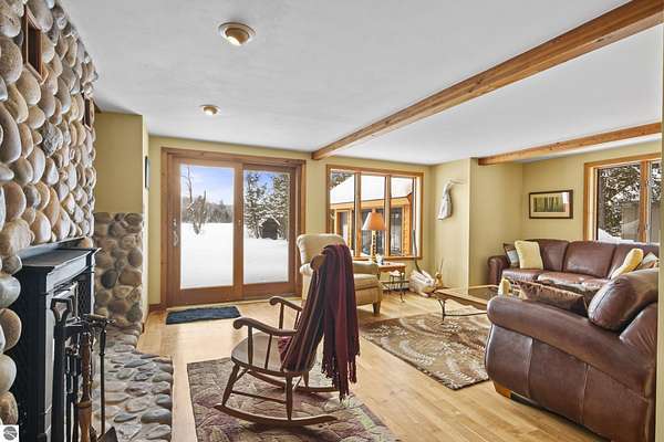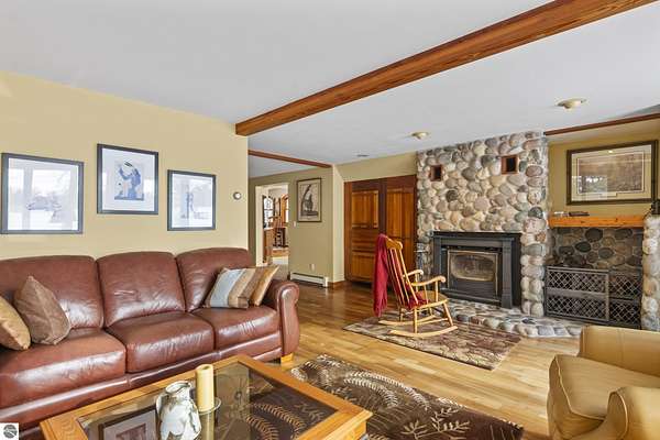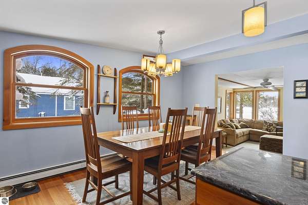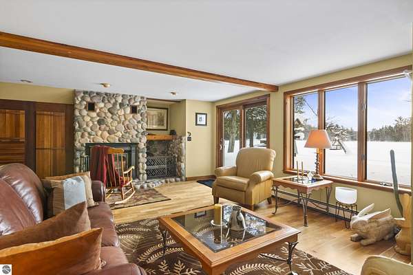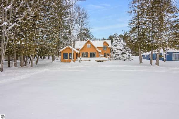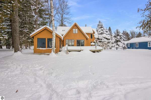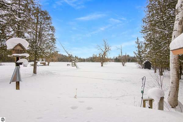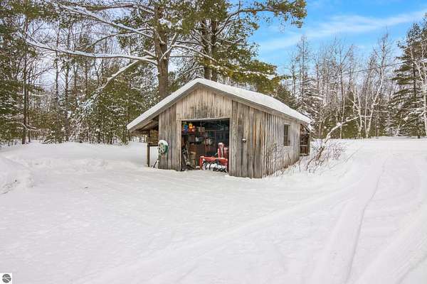Enjoy no-wake lakefront living on Bellows Lake in this well-maintained 3-bedroom, 2-bath home showcasing quality craftsmanship throughout. Features include an updated eat-in kitchen with island, spacious living and family rooms with stone fireplace, walk-in closets, and built-in speakers in the living room, plus a new roof (2022) for added peace of mind. Outdoor living includes a screened-in porch and deck overlooking the water. Property highlights include an oversized insulated garage with workshop, upper-level overflow room with ceiling fan, 8'x10' lakeside storage shed, additional outbuildings--all with electricity--and a private dock. The home sits on .43 acres and is combined with additional parcels totaling approximately 2 acres with 64 feet of private lake frontage, accessed by a well-maintained gravel road, making it ideal as a year-round residence or an Up North retreat.