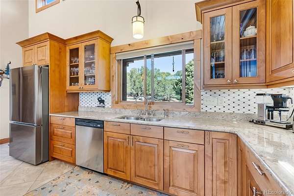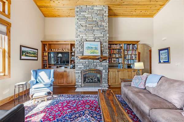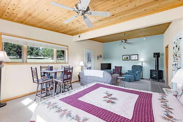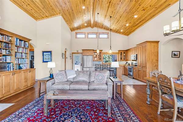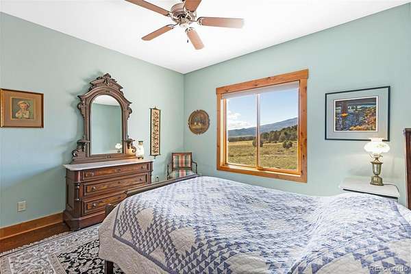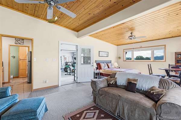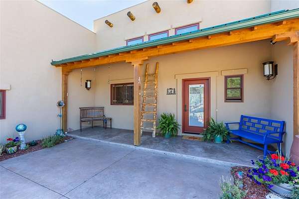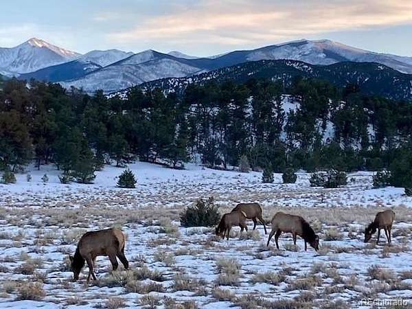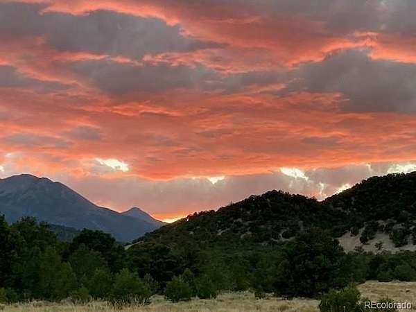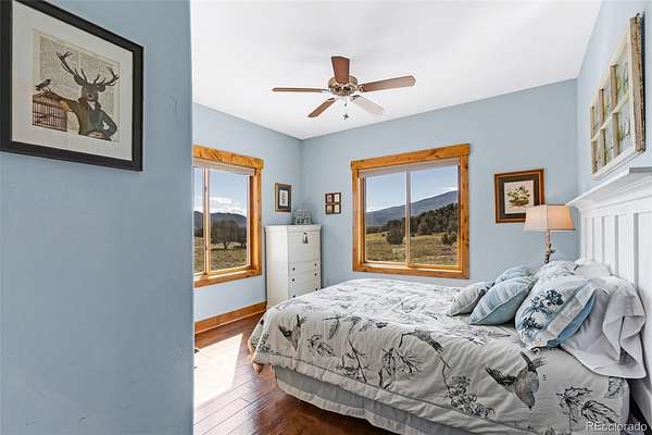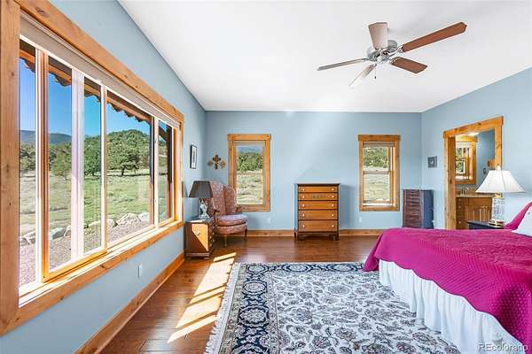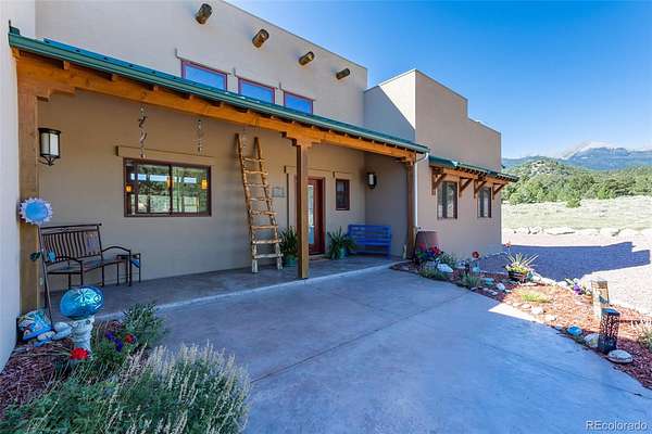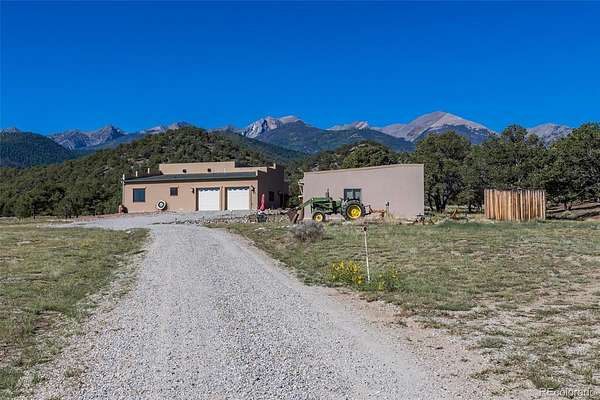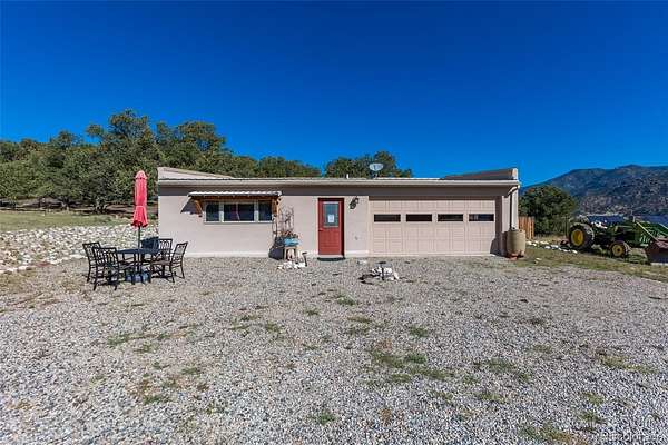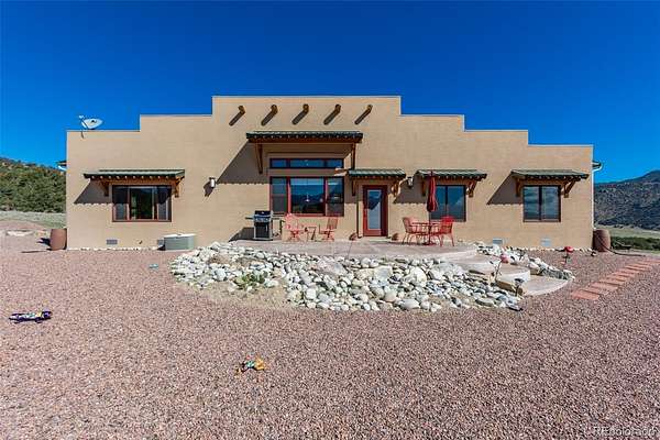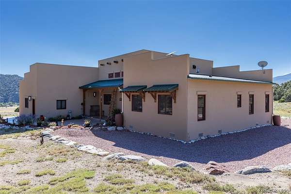 This beautiful custom home on 40 acres is a peaceful and quiet refuge, just 18 miles east of Salida. Enjoy mountain and valley views and a varied landscape frequented by herds of elk. There is a separate guest house for overflow guests, caregiver, or tenants, with kitchen and 3/4 bath as well as attached garage. The main house features vaulted beetle-kill pine ceiling in the great room and a gas fireplace with hearth custom made from wood harvested from the land. All wood floors and tile with in-floor radiant heat system for warm toes in the winter. A split floor plan allows for a spacious primary suite with stunning views to the south and 36 inch doorways. An office or 4th bedroom is located off the great room as well as a smaller room for multiple uses. On the other side of the house are two bedrooms and a bathroom, as well as the laundry room with ample cabinets and utility sink. There is also a spacious two car attached garage and solar panels mean electric bill is kept to a minimum. Serenity and space awaits!