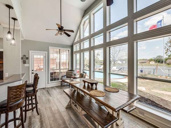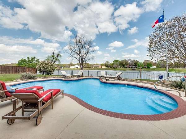 Nestled on almost 2 acres of picturesque property, this meticulously maintained home offers an unparalleled waterfront lifestyle. Enjoy a private pool, a charming covered patio, a 2-car attached garage, and a bonus detached garage—perfect as a man cave or workshop. The man cave features a glass overhead door that opens up to breathtaking pond views, creating a seamless connection between indoor and outdoor spaces, ideal for relaxation and entertainment. The backyard is securely enclosed with a new iron fence, perfect for pets or children to enjoy the space safely. Inside, the spacious living room, kitchen, and dining area are thoughtfully designed to highlight the beauty of the outdoors, with expansive windows that invite natural light and offer sweeping views of the tranquil pond and inviting pool. The dining area, with its floor-to-ceiling windows, frames the serene backyard oasis, making every meal feel like an experience in paradise. The master suite is spacious, offering a large walk-in closet, separate vanities, and a separate tub and shower for ultimate comfort and convenience. Various updates throughout the home, including roof, gutters, fencing, water heater, AC unit, epoxy flooring in garages, paint, refrigerator, microwave, pool plaster, pool equipment and dock make this property move-in ready and even more appealing! Indulge in the serenity and luxury of waterfront living, where every day feels like a getaway. This exceptional home offers the perfect blend of comfort, beauty, and functionality—don't miss the chance to make this waterfront retreat your new home. Schedule a viewing today and see it for yourself!