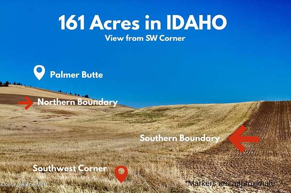 161-Acre outdoor paradise on Palmer Butte near the foothills of McCroskey State Park. (Subdivision available w/ smallest parcel being 1 Acre). Perfect for outdoor enthusiasts, offering easy access to ATV, horseback, & hiking trails that span 5,000 Ac of public land. Breathtaking 180-degree southern views that stretch across the Palouse & Steptoe Butte. County-maintained Evergreen Road on the east, Simmons Road (summer rd) west. INCOME PROPERTY - Currently in dryland agricultural production with a tenant farmer lease. A true gem-abundant with elk, whitetail deer, mule deer, turkey, upland birds & more! Located in Idaho (Farmington, Washington mailing address). Whether you're chasing elk at sunrise, photographing sunsets, riding ATVs, or soaking in the quiet beauty of the mountains, this property offers everything; a rare blend of recreation, income potential, & Idaho freedom. No HOA.