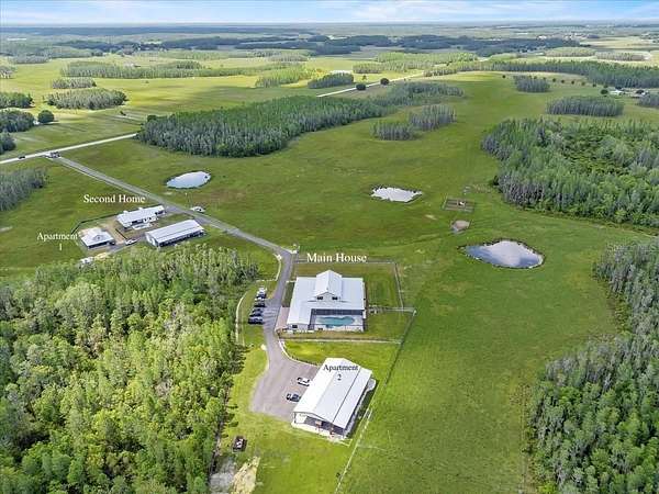 Welcome to Heaven on Earth - MULTI HOME-Family Compound in North Lakeland. Tucked away on over 100 acres of improved pasture, scattered cypress heads, and multiple ponds this extraordinary family compound offers a rare blend of rustic luxury, multi-generational living, and serene Florida countryside. Abundant with wildlife including deer, turkey, and cows, this one-of-a-kind estate is the perfect setting for those seeking space, privacy, and endless possibilities. The Main House 11657 Moore Rd. (2023): Reminiscent of a traditional Barndominium, the main residence is a custom-built masterpiece with nearly 12,000 sq ft under roof (approx. 7,000 sq ft of living space). Constructed with block and poured concrete, metal siding, and designed for longevity, comfort, and function -- this home is both ADA-compliant and visually striking. Inside, soaring ceilings with exposed wooden beams, an expansive open-concept kitchen with high-end stainless appliances, and a massive walk-in pantry make everyday living and entertaining effortless. The large island is ideal for hosting those large gatherings or simply serving your Sunday morning breakfast. The home features 5 bedrooms and 4 bathrooms, including dual primary suites connected by a luxurious Jack-and-Jill bathroom with a soaking tub and oversized shower. Two additional guest suites have private en-suite baths. A spacious mudroom and bonus utility room for storage, workspace, or pet accommodations. The true star of the show is the stone wood burning fireplace located centrally in the grand sized family room. A detached 588 sq ft bonus room (ideal for a game room, gym, or office) connects via covered breezeway and oversized carport, perfect for ATVs or full-size vehicles. Outside is an entertainers dream, enjoy a resort-style screened heated pool and spa with beach entry, fountains and amazing light features. The details in the expansive wrap around porch are simply amazing. From stamped concrete to tongue-and-groove ceilings, stone work and beautiful beams it truly is breathtaking. For added comfort this home does feature a full-property industrial-grade generator capable of powering the home for up to two weeks. 2nd Home 11651 Moore Rd. (2019): Privately set along the asphalt drive, this custom-built 3 bedroom, 2.5 bathroom farmhouse-style residence offers nearly 3,000 sq ft of living space. Designed with both comfort and style in mind, it boasts an entertainer's kitchen with granite countertops and a large central island, a generous den/playroom, and pool-access half bath. Outdoors features a sparkling pool and spa with travertine decking and fenced yard. Metal roof and large carport complete this charming yet modern home. Additional Living Spaces & Structures: Free-Standing Two-Story Apartment: Loft-style barndominium with 1 bedroom, 1 full bath, full kitchen, washer/dryer, upstairs loft, open carport, and screened lanai. Workshop #1: Enclosed space with side attached open pole barn -- perfect for storing farm equipment. Workshop #2 with Luxury Apartment attached: Large shop with pole barn area and a brand new luxury two-story apartment with 1 bedroom, 1 bath, full kitchen, and loft. This estate is zoned agricultural with potential for additional dwellings under the ag exemption. Whether you're looking for a working ranch, multi-generational homestead, or event-friendly destination, this property is a true legacy compound. Parcel 24-26-21-000000-031010 included in listing price.