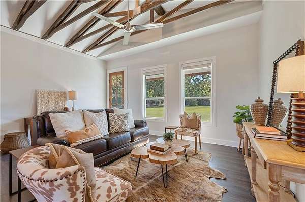 Experience refined country living just minutes from town in this gorgeous home set on 2.4 serene acres. Designed with both comfort and elegance in mind, the home welcomes you with an expansive open-concept layout accented by striking wood beams and beautiful windows that flood the home with natural light. The thoughtfully appointed kitchen features a farmhouse sink, abundant cabinetry, generous counter space, and an updated appliance package. Each of the three spacious bedrooms offers its own unique charm, complete with stylish barn door accents. The private primary suite provides a peaceful retreat featuring a tiled shower/tub, elevated vanity, and an impressive closet designed for exceptional storage. Extend your living space outdoors on the full-length covered back porch, great for quiet morning coffee, evening sunsets, and enjoying the tranquil surroundings. Completing the property is a versatile metal-framed workshop equipped with two overhead doors - ideal for hobbies, equipment, or additional storage. This exceptional property offers the rare balance of privacy, open space, and convenience - all just a short drive from restaurants, shopping, and schools. A truly special opportunity to embrace the beauty of country living just minutes from town!