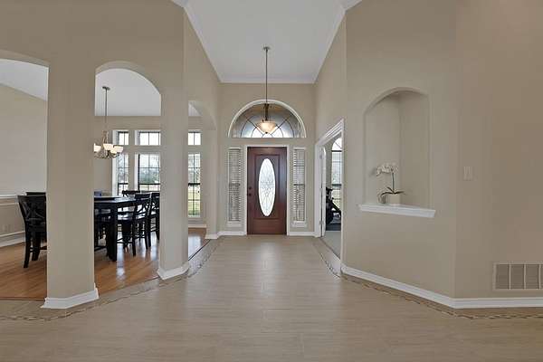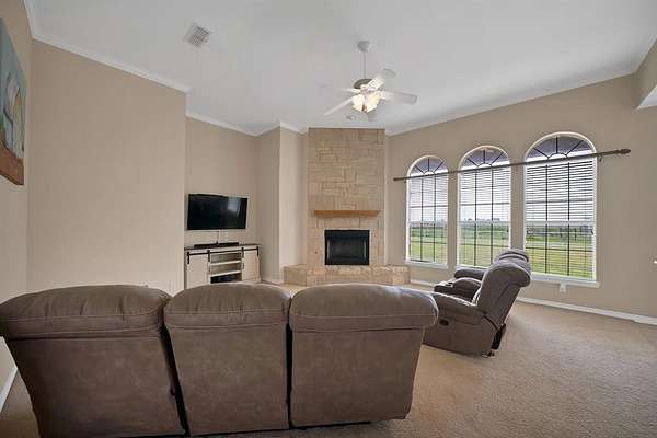 Architectural details elevate the interior with soaring vaulted ceilings, elegant curved archways and an atrium-style entry filled with natural light. The open design flows seamlessly into a warm living space anchored by a white rock fireplace and expansive windows framing serene acreage views.