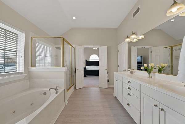 The primary suite offers dual walk-in closets, a spa-inspired bath with slate flooring, jetted soaking tub, oversized shower, and dual vanities.